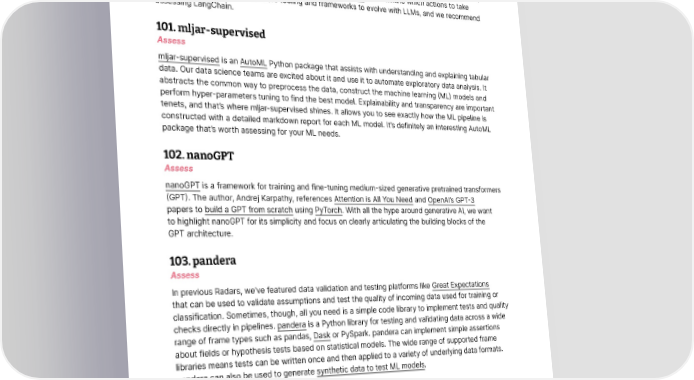 Languages and Frameworks 100. LangChain Assess LangChain is a framework for building applications with large language models (LLMs). These models have triggered a race to incorporate generative AI in several use cases. However, using these LLMs in isolation may not be enough — you have to combine them with your differentiated assets to build an impactful product. LangChain fills this niche with some neat features, including prompt management, chaining, data augmented generation and a rich set of agents to determine which actions to take and in what order. We expect more tooling and frameworks to evolve with LLMs, and we recommend assessing LangChain. 101. mljar-supervised Assess mljar-supervised is an AutoML Python package that assists with understanding and explaining tabular data. Our data science teams are excited about it and use it to automate exploratory data analysis. It abstracts the common way to preprocess the data, construct the machine learning (ML) models and perform hyper-parameters tuning to find the best model. Explainability and transparency are important tenets, and that’s where mljar-supervised shines. It allows you to see exactly how the ML pipeline is constructed with a detailed markdown report for each ML model. It’s definitely an interesting AutoML package that’s worth assessing for your ML needs. 102. nanoGPT Assess nanoGPT is a framework for training and fine-tuning medium-sized generative pretrained transformers (GPT). The author, Andrej Karpathy, references Attention is All You Need and OpenAI’s GPT-3 papers to build a GPT from scratch using PyTorch. With all the hype around generative AI, we want to highlight nanoGPT for its simplicity and focus on clearly articulating the building blocks of the GPT architecture. 103. pandera Assess In previous Radars, we’ve featured data validation and testing platforms like Great Expectations that can be used to validate assumptions and test the quality of incoming data used for training or classification. Sometimes, though, all you need is a simple code library to implement tests and quality checks directly in pipelines. pandera is a Python library for testing and validating data across a wide range of frame types such as pandas, Dask or PySpark. pandera can implement simple assertions about fields or hypothesis tests based on statistical models. The wide range of supported frame libraries means tests can be written once and then applied to a variety of underlying data formats. pandera can also be used to generate synthetic data to test ML models. © Thoughtworks, Inc. All Rights Reserved. 44