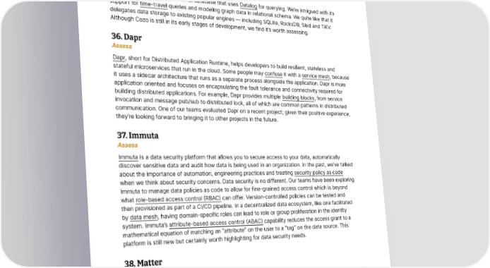 Platforms of autonomous driving, such as perception, decision-making and control. It also has a planning and control module that generates a trajectory for the vehicle based on its environment and objectives. It encourages open innovations in autonomous driving technology. We’re building prototypes using Autoware to validate new product ideas and find it helpful. 35. Cozo Assess Cozo is an embeddable relational database that uses Datalog for querying. We’re intrigued with its support for time-travel queries and modeling graph data in relational schema. We quite like that it delegates data storage to existing popular engines — including SQLite, RocksDB, Sled and TiKV. Although Cozo is still in its early stages of development, we find it’s worth assessing. 36. Dapr Assess Dapr, short for Distributed Application Runtime, helps developers to build resilient, stateless and stateful microservices that run in the cloud. Some people may confuse it with a service mesh, because it uses a sidecar architecture that runs as a separate process alongside the application. Dapr is more application oriented and focuses on encapsulating the fault tolerance and connectivity required for building distributed applications. For example, Dapr provides multiple building blocks, from service invocation and message pub/sub to distributed lock, all of which are common patterns in distributed communication. One of our teams evaluated Dapr on a recent project; given their positive experience, they’re looking forward to bringing it to other projects in the future. 37. Immuta Assess Immuta is a data security platform that allows you to secure access to your data, automatically discover sensitive data and audit how data is being used in an organization. In the past, we’ve talked about the importance of automation, engineering practices and treating security policy as code when we think about security concerns. Data security is no different. Our teams have been exploring Immuta to manage data policies as code to allow for fine-grained access control which is beyond what role-based access control (RBAC) can offer. Version-controlled policies can be tested and then provisioned as part of a CI/CD pipeline. In a decentralized data ecosystem, like one facilitated by data mesh, having domain-specific roles can lead to role or group proliferation in the identity system. Immuta’s attribute-based access control (ABAC) capability reduces the access grant to a mathematical equation of matching an “attribute” on the user to a “tag” on the data source. This platform is still new but certainly worth highlighting for data security needs. 38. Matter Assess Matter is an open standard for smart home technology, launched by Amazon, Apple, Google, Comcast and the Zigbee Alliance (now Connectivity Standards Alliance, or CSA). It enables devices to work with any Matter-certified ecosystem, thus reducing fragmentation and promoting interoperability among devices and IoT platforms from different providers. Its focus on standardization at the © Thoughtworks, Inc. All Rights Reserved. 24