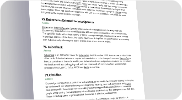 Tools 74. Kepler Assess Measuring energy consumption is an important step for teams to reduce the carbon footprint of their software. Cloud Carbon Footprint (CCF) estimates energy based on billing and usage data retrieved from cloud APIs. Kepler — short for Kubernetes-based Efficient Power Level Exporter — goes one step further: it uses software counters via RAPL, ACPI and nvml to measure power consumption by hardware resources and employs an eBPF-based approach to attribute power consumption to processes, containers and Kubernetes pods. Power usage is then converted to energy estimates using a custom ML model and data from the SPEC Power benchmark. Finally, pod-level energy consumption reporting is made available as Prometheus metrics. In cases where Kubernetes is running on virtual machines, for example when not using bare metal instances, Kepler uses cgroups to estimate energy consumption. We’ve had significant experience with CCF and can attest to its usefulness, but we’re intrigued by the Kepler project’s approach. 75. Kubernetes External Secrets Operator Assess Kubernetes External Secrets Operator allows external secret providers to be integrated with Kubernetes. It reads from the external provider API and injects the result into a Kubernetes Secret. The operator works with a large variety of secret management tools, including some we’ve featured in previous editions of the Radar. Our teams have found it simplified the use of secrets when working with Kubernetes by allowing the use of a single store across a whole project. 76. Kubeshark Assess Kubeshark is an API traffic viewer for Kubernetes. Until November 2022, it was known as Mizu. Unlike other tools, Kubeshark does not require instrumentation or code changes. It runs as a DaemonSet to inject a container at the node level in your Kubernetes cluster and performs tcpdump-like operations. We find it useful as a debugging tool, as it can observe all API communications across multiple protocols (REST, gRPC, Kafka, AMQP and Redis) in real time. 77. Obsidian Assess Knowledge management is critical for tech workers, as we need to be constantly learning and staying up to date with the latest technology developments. Recently, tools such as Obsidian and Logseq have emerged in the category of note-taking tools that support linking notes to form a knowledge graph, while storing them in plain markdown files in a local directory, thus letting users own their data. These tools help users organize and link their notes in a flexible, nonlinear way. Obsidian has a rich repository of community plugins. Some that have caught our attention, in particular, are Canvas, akin to a local version of Miro or Mural, and Dataview, which effectively treats your notes as a database and provides a query language for filtering, sorting and extracting data from your markdown notes. © Thoughtworks, Inc. All Rights Reserved. 36