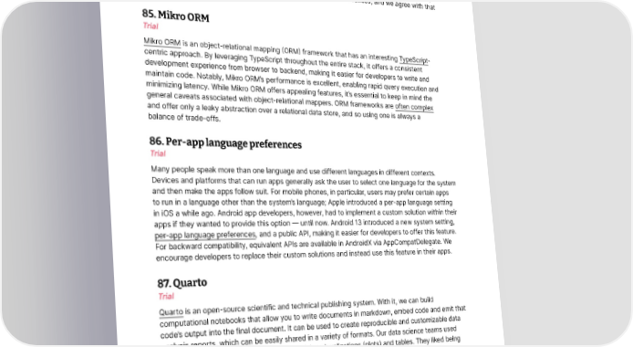 Languages and Frameworks 84.Jetpack DataStore Trial Jetpack DataStore is a new data storage solution to store data asynchronously, consistently and transactionally. It has two implementations: Preferences DataStore for untyped key-value pairs and Proto DataStore for complex data types using Protobufs. By default it is used with Kotlin coroutines and Flow but additional support for RXJava 2 and 3 is available. The documentation recommends you consider migrating to DataStore if you’re currently using SharedPreferences, and we agree with that recommendation. 85.Mikro ORM Trial Mikro ORM is an object-relational mapping (ORM) framework that has an interesting TypeScript- centric approach. By leveraging TypeScript throughout the entire stack, it offers a consistent development experience from browser to backend, making it easier for developers to write and maintain code. Notably, Mikro ORM’s performance is excellent, enabling rapid query execution and minimizing latency. While Mikro ORM offers appealing features, it’s essential to keep in mind the general caveats associated with object-relational mappers. ORM frameworks are often complex and offer only a leaky abstraction over a relational data store, and so using one is always a balance of trade-offs. 86.Per-app language preferences Trial Many people speak more than one language and use different languages in different contexts. Devices and platforms that can run apps generally ask the user to select one language for the system and then make the apps follow suit. For mobile phones, in particular, users may prefer certain apps to run in a language other than the system’s language; Apple introduced a per-app language setting in iOS a while ago. Android app developers, however, had to implement a custom solution within their apps if they wanted to provide this option — until now. Android 13 introduced a new system setting, per-app language preferences, and a public API, making it easier for developers to offer this feature. For backward compatibility, equivalent APIs are available in AndroidX via AppCompatDelegate. We encourage developers to replace their custom solutions and instead use this feature in their apps. 87.Quarto Trial Quarto is an open-source scientific and technical publishing system. With it, we can build computational notebooks that allow you to write documents in markdown, embed code and emit that code’s output into the final document. It can be used to create reproducible and customizable data analysis reports, which can be easily shared in a variety of formats. Our data science teams used Quarto to share data analysis reports containing visualizations (plots) and tables. They liked being able to use R and Python to generate these dynamic reports and then export them as HTML to share with stakeholders. If you’re looking to share your research and analysis within or outside of your organization, we recommend evaluating Quarto. © Thoughtworks, Inc. All Rights Reserved. 40