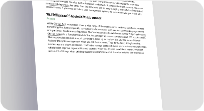 Tools 78. Ory Kratos Assess We’ve already assessed Ory Hydra as a self-hosted OAuth2 solution, and the feedback from the team has been good. This time, we turn to Ory Kratos, an API-first identity and user management system that’s developer friendly and easy to customize. It already provides common functions we want to achieve in an identity management system, including self-service login and registration, multi-factor authentication (MFA/2FA), account verification and account recovery. Like Hydra, Kratos is headless and requires developers to build the UI themselves, which gives the team more flexibility. Developers can also customize identity schema to fit different business contexts. Kratos has no external dependencies other than the database, and it’s easy to deploy and scale in different cloud environments. If you need to build a user management system, we recommend you give Kratos a try. 79. Philips’s self-hosted GitHub runner Assess While GitHub Actions runners cover a wide range of the most common runtimes, sometimes you need something that is more specific to your particular use case, such as a less common language runtime or a particular hardware configuration. That’s when you need a self-hosted runner. Philips’s self-hosted GitHub runner is a Terraform module that lets you spin up custom runners on AWS EC2 spot instances. The module also creates a set of Lambdas to make up for the fact that you lose some of GitHub Actions’ lifecycle management when you self-host runners. They do the heavy lifting for scaling runners up and down as needed. That helps manage costs and allows you to make runners ephemeral, which helps improve repeatability and security. When you do need to self-host runners, you might miss a lot of things when building custom runners from scratch. Look for tools like this one instead. © Thoughtworks, Inc. All Rights Reserved. 37