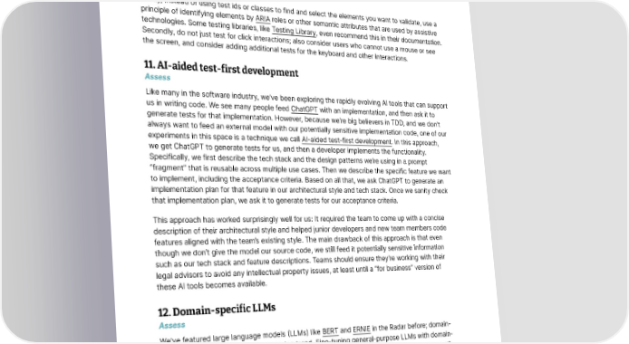 Techniques 10.Accessibility-aware component test design Assess One of the many places in the software delivery process to consider accessibility requirements early on is during web component testing. Testing framework plugins like chai-a11y-axe provide assertions in their API to check for the basics. But in addition to using what testing frameworks have to offer, accessibility-aware component test design further helps to provide all the semantic elements needed by screen readers and other assistive technologies. Firstly, instead of using test ids or classes to find and select the elements you want to validate, use a principle of identifying elements by ARIA roles or other semantic attributes that are used by assistive technologies. Some testing libraries, like Testing Library, even recommend this in their documentation. Secondly, do not just test for click interactions; also consider users who cannot use a mouse or see the screen, and consider adding additional tests for the keyboard and other interactions. 11.AI-aided test-first development Assess Like many in the software industry, we’ve been exploring the rapidly evolving AI tools that can support us in writing code. We see many people feed ChatGPT with an implementation, and then ask it to generate tests for that implementation. However, because we’re big believers in TDD, and we don’t always want to feed an external model with our potentially sensitive implementation code, one of our experiments in this space is a technique we call AI-aided test-first development. In this approach, we get ChatGPT to generate tests for us, and then a developer implements the functionality. Specifically, we first describe the tech stack and the design patterns we’re using in a prompt “fragment” that is reusable across multiple use cases. Then we describe the specific feature we want to implement, including the acceptance criteria. Based on all that, we ask ChatGPT to generate an implementation plan for that feature in our architectural style and tech stack. Once we sanity check that implementation plan, we ask it to generate tests for our acceptance criteria. This approach has worked surprisingly well for us: It required the team to come up with a concise description of their architectural style and helped junior developers and new team members code features aligned with the team’s existing style. The main drawback of this approach is that even though we don’t give the model our source code, we still feed it potentially sensitive information such as our tech stack and feature descriptions. Teams should ensure they’re working with their legal advisors to avoid any intellectual property issues, at least until a “for business” version of these AI tools becomes available. 12.Domain-specific LLMs Assess We’ve featured large language models (LLMs) like BERT and ERNIE in the Radar before; domain- specific LLMs, however, are an emerging trend. Fine-tuning general-purpose LLMs with domain- specific data can tailor them for various tasks, including information retrieval, customer support augmentation and content creation. This practice has shown promising results in industries like legal and finance, as demonstrated by OpenNyAI for legal document analysis. With more organizations experimenting with LLMs and new models like GPT4 being released, we can expect more domain-specific use cases in the near future. © Thoughtworks, Inc. All Rights Reserved. 15