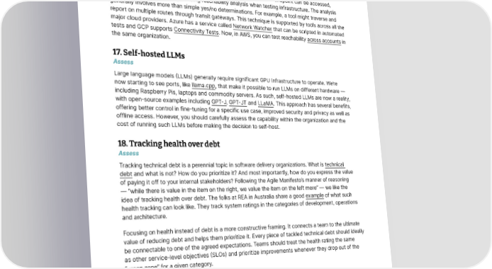 Techniques 16.Reachability analysis when testing infrastructure Assess When deploying infrastructure as code, we’ve noticed that a lot of time can be spent diagnosing and repairing production issues that result from systems being unable to communicate with one another. Because the network topology between them can be complex, the entire route may not be traversable even if individual ports and endpoints have been configured correctly. Infrastructure testing practices usually include verifying the right ports are open or closed or that an endpoint can be accessed, but we’ve only recently begun doing reachability analysis when testing infrastructure. The analysis generally involves more than simple yes/no determinations. For example, a tool might traverse and report on multiple routes through transit gateways. This technique is supported by tools across all the major cloud providers. Azure has a service called Network Watcher that can be scripted in automated tests and GCP supports Connectivity Tests. Now, in AWS, you can test reachability across accounts in the same organization. 17.Self-hosted LLMs Assess Large language models (LLMs) generally require significant GPU infrastructure to operate. We’re now starting to see ports, like llama.cpp, that make it possible to run LLMs on different hardware — including Raspberry Pis, laptops and commodity servers. As such, self-hosted LLMs are now a reality, with open-source examples including GPT-J, GPT-JT and LLaMA. This approach has several benefits, offering better control in fine-tuning for a specific use case, improved security and privacy as well as offline access. However, you should carefully assess the capability within the organization and the cost of running such LLMs before making the decision to self-host. 18.Tracking health over debt Assess Tracking technical debt is a perennial topic in software delivery organizations. What is technical debt and what is not? How do you prioritize it? And most importantly, how do you express the value of paying it off to your internal stakeholders? Following the Agile Manifesto’s manner of reasoning — “while there is value in the item on the right, we value the item on the left more” — we like the idea of tracking health over debt. The folks at REA in Australia share a good example of what such health tracking can look like. They track system ratings in the categories of development, operations and architecture. Focusing on health instead of debt is a more constructive framing. It connects a team to the ultimate value of reducing debt and helps them prioritize it. Every piece of tackled technical debt should ideally be connectable to one of the agreed expectations. Teams should treat the health rating the same as other service-level objectives (SLOs) and prioritize improvements whenever they drop out of the “green zone” for a given category. © Thoughtworks, Inc. All Rights Reserved. 17