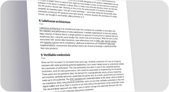 Techniques 7. Demo frontends for API-only products Trial One of the big challenges in developing APIs is capturing and communicating their business value. APIs are, by their nature, technical artifacts. Whereas developers can easily comprehend JSON payloads, OpenAPI (Swagger) specs and Postman demos, business stakeholders tend to respond better to demos they can interact with. The value of the product is more clearly articulated when you can see and touch it, which is why we sometimes find it worthwhile to invest in demo frontends for API-only products. When a custom graphical UI is built alongside an API product, stakeholders can see analogies to paper forms or reports that might be more familiar to them. As the interaction model and richness of the demo UI evolves, it allows them to make more informed decisions about the direction the API product should take. Working on the UI has the added benefit of increasing developers’ empathy for business users. This isn’t a new technique — we’ve been doing this successfully when necessary as long as API products have been around. However, because this technique isn’t widely known, we thought it worthwhile calling attention to it. 8. Lakehouse architecture Trial Lakehouse architecture is an architectural style that combines the scalability of data lakes with the reliability and performance of data warehouses. It enables organizations to store and analyze large volumes of diverse data in a single platform as opposed to having them in separate lake and warehouse tiers, using the same familiar SQL-based tools and techniques. While the term is often associated with vendors like Databricks, open alternatives such as Delta Lake, Apache Iceberg and Apache Hudi are worth considering. Lakehouse architecture can complement data mesh implementations. Autonomous data product teams can choose to leverage a Lakehouse within their data products. 9. Verifiable credentials Trial When we first included it in the Radar three years ago, verifiable credentials (VC) was an intriguing standard with some promising potential applications, but it wasn’t widely known or understood outside the community of enthusiasts. This was particularly true when it came to the credential-granting institutions, such as state governments, who would be responsible for implementing the standards. Three years and one pandemic later, the demand for cryptographically secure, privacy-respecting and machine-verifiable electronic credentials has grown and, as a result, governments are starting to wake up to VC’s potential. The W3C standard puts credential holders at the center, which is similar to our experience when using physical credentials: users can put their verifiable credentials in their own digital wallets and show them to anyone at any time without the permission of the credentials’ issuer. This decentralized approach also helps users to better manage and selectively disclose their own information which greatly improves data privacy protection. Several of our teams have engaged in projects involving verifiable credentials technology in the past six months. Not surprisingly, the scenarios vary across countries and government departments. Our team has explored different combinations of decentralized identifiers, verifiable credentials and verifiable presentation on multiple projects. This is a developing field, and now that we’ve had more experience, we want to keep track of it in the Radar. © Thoughtworks, Inc. All Rights Reserved. 14