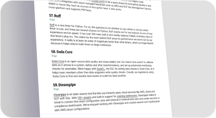 Tools 56. Mozilla SOPS Trial Our advice when it comes to secrets management has always been to decouple it from source code. However, teams are often presented with a tradeoff between full automation (in the spirit of infrastructure as code) versus a few manual steps (using tools like vaults) for managing, seeding and rotating seed secrets. For instance, our teams use SOPS to manage seed credentials for bootstrapping infrastructure. In some situations, however, it’s impossible to remove secrets from legacy code repositories. For such needs, we found Mozilla SOPS to be a good choice for encrypting secrets in text files. SOPS integrates with cloud-managed keystores such as AWS and GCP Key Management Service (KMS) or Azure Key Vault as sources of encryption keys. It also works cross-platform and supports PGP keys. 57. Ru昀昀 Trial Ruff is a new linter for Python. For us, the question is not whether to use a linter or not but which linter to use, and there are several choices for Python. Ruff stands out for two reasons: its out-of-box experience and its speed. It has over 500 rules built in and readily replaces Flake8, including many of that linter’s plug-ins. The claims by the team behind Ruff about its performance are borne out by our experience. It really is at least an order of magnitude faster than other linters, which is a huge benefit because it helps reduce build times on large codebases. 58. Soda Core Trial Soda Core is an open-source data quality and observability tool. Our teams have used it to validate data as it arrives in a system, before and after transformations, and set up automated monitoring checks for anomalies. We’re happy with SodaCL, the DSL for writing data checks in Soda Core, as it helps team members other than data engineers write quality checks. Overall, our experience using Soda Core to find and resolve data issues at scale has been positive. 59. Steampipe Trial Steampipe is an open-source tool that lets you instantly query cloud services like AWS, Azure and GCP with SQL. With 100+ plugins and built-in support for creating dashboards, Steampipe makes it trivial to connect live cloud configuration data with internal or external data sets and create security or compliance dashboards. We’ve enjoyed working with Steampipe and created several such dashboards with AWS cloud configurations. © Thoughtworks, Inc. All Rights Reserved. 31