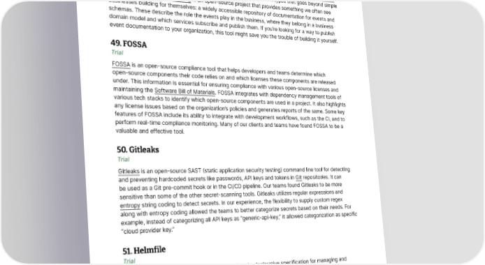 Tools 48. EventCatalog Trial Enterprises now often use event streaming as the source of truth and as an information-sharing mechanism in microservices architectures. This creates the need to standardize event types and share those standards across the enterprise. Event schema registries are commonly deployed but the existing offerings tend to be specialized to a single broker such as Apache Kafka or Azure Event Hub. They also fall short of conveying rich documentation about event types that goes beyond simple schema definitions. EventCatalog is an open-source project that provides something we often see businesses building for themselves: a widely accessible repository of documentation for events and schemas. These describe the role the events play in the business, where they belong in a business domain model and which services subscribe and publish them. If you’re looking for a way to publish event documentation to your organization, this tool might save you the trouble of building it yourself. 49. FOSSA Trial FOSSA is an open-source compliance tool that helps developers and teams determine which open-source components their code relies on and which licenses these components are released under. This information is essential for ensuring compliance with various open-source licenses and maintaining the Software Bill of Materials. FOSSA integrates with dependency management tools of various tech stacks to identify which open-source components are used in a project. It also highlights any license issues based on the organization’s policies and generates reports of the same. Some key features of FOSSA include its ability to integrate with development workflows, such as the CI, and to perform real-time compliance monitoring. Many of our clients and teams have found FOSSA to be a valuable and effective tool. 50. Gitleaks Trial Gitleaks is an open-source SAST (static application security testing) command line tool for detecting and preventing hardcoded secrets like passwords, API keys and tokens in Git repositories. It can be used as a Git pre-commit hook or in the CI/CD pipeline. Our teams found Gitleaks to be more sensitive than some of the other secret-scanning tools. Gitleaks utilizes regular expressions and entropy string coding to detect secrets. In our experience, the flexibility to supply custom regex along with entropy coding allowed the teams to better categorize secrets based on their needs. For example, instead of categorizing all API keys as “generic-api-key,” it allowed categorization as specific “cloud provider key.” 51. Helmfile Trial Helmfile is an open-source command line tool and a declarative specification for managing and installing a collection of Helm charts. You can use it to help with version control of the Helm values files, the charts used and other overrides. It enables CI/CD workflows with Helm charts and helps create reproducible environments. We’ve used Helmfile to manage complex deployments with multiple dozens of Helm charts and found it simplifies the deployment workflow. © Thoughtworks, Inc. All Rights Reserved. 29