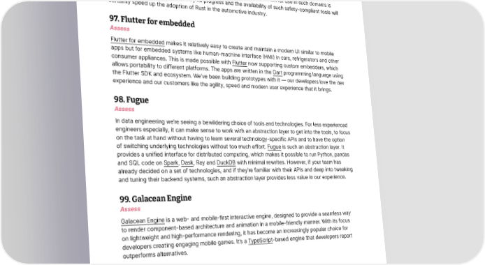 Languages and Frameworks 96. Ferrocene Assess The Rust language has been gaining popularity in recent years for its safety, performance and concurrency features. However, certified Rust toolchains have been missing for applications in safety-critical markets like automotive. This gap is being addressed by Ferrocene, a Rust compiler toolchain. Ferrocene promises to be ISO26262 functional safety standard compliant for the electronic systems in road vehicles; an effort to qualify the language and toolchain for use in such domains is already underway. We’re excited by its progress and the availability of such safety-compliant tools will certainly speed up the adoption of Rust in the automotive industry. 97. Flutter for embedded Assess Flutter for embedded makes it relatively easy to create and maintain a modern UI similar to mobile apps but for embedded systems like human-machine interface (HMI) in cars, refrigerators and other consumer appliances. This is made possible with Flutter now supporting custom embedders, which allows portability to different platforms. The apps are written in the Dart programming language using the Flutter SDK and ecosystem. We’ve been building prototypes with it — our developers love the dev experience and our customers like the agility, speed and modern user experience that it brings. 98. Fugue Assess In data engineering we’re seeing a bewildering choice of tools and technologies. For less experienced engineers especially, it can make sense to work with an abstraction layer to get into the tools, to focus on the task at hand without having to learn several technology-specific APIs and to have the option of switching underlying technologies without too much effort. Fugue is such an abstraction layer. It provides a unified interface for distributed computing, which makes it possible to run Python, pandas and SQL code on Spark, Dask, Ray and DuckDB with minimal rewrites. However, if your team has already decided on a set of technologies, and if they’re familiar with their APIs and deep into tweaking and tuning their backend systems, such an abstraction layer provides less value in our experience. 99. Galacean Engine Assess Galacean Engine is a web- and mobile-first interactive engine, designed to provide a seamless way to render component-based architecture and animation in a mobile-friendly manner. With its focus on lightweight and high-performance rendering, it has become an increasingly popular choice for developers creating engaging mobile games. It’s a TypeScript-based engine that developers report outperforms alternatives. © Thoughtworks, Inc. All Rights Reserved. 43