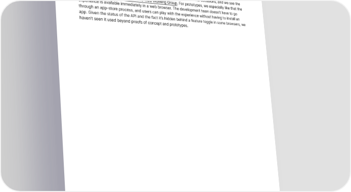 Languages and Frameworks 107.WebXR Device API Assess When working on the WebVR experimental API, it became clear that it would make more sense to have a combined API for VR and AR. Rather than changing the WebVR API significantly, a new specification was created: WebXR. At its core is the WebXR Device API which provides key capabilities for writing VR and AR applications in a web browser. The API is extensive, and at the time of writing it isn’t fully supported by all browsers. Our teams have used WebXR on several occasions, and we see the benefits described by the Immersive Web Working Group. For prototypes, we especially like that the experience is available immediately in a web browser. The development team doesn’t have to go through an app-store process, and users can play with the experience without having to install an app. Given the status of the API and the fact it’s hidden behind a feature toggle in some browsers, we haven’t seen it used beyond proofs of concept and prototypes. © Thoughtworks, Inc. All Rights Reserved. 46