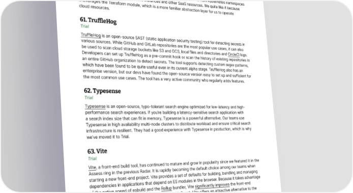 Tools 60. Terraform Cloud Operator Trial More and more teams are using the Kubernetes Operators pattern to manage their Kubernetes clusters. We used to recommend Crossplane for this, and now we have an alternative tool, Terraform Cloud Operator for Kubernetes. This tool integrates Terraform Cloud and Kubernetes by extending the Kubernetes control plane to enable lifecycle management of cloud and on-premise infrastructures through Kubernetes manifests. Our team uses it to provision resources from Kubernetes namespaces and RoleBindings to cloud database instances and other SaaS resources. We quite like it because it leverages the Terraform module, which is a more familiar abstraction layer for us to operate cloud resources. 61. Tru昀툀eHog Trial TruffleHog is an open-source SAST (static application security testing) tool for detecting secrets in various sources. While GitHub and GitLab repositories are the most popular use cases, it can also be used to scan cloud storage buckets like S3 and GCS, local files and directories and CircleCI logs. Developers can set up TruffleHog as a pre-commit hook or scan the history of existing repositories in an entire GitHub organization to detect secrets. The tool supports detecting custom regex patterns, which have been found to be quite useful even in its current alpha stage. TruffleHog also has an enterprise version, but our devs have found the open-source version easy to set up and sufficient for the most common use cases. The tool has a very active community who regularly adds features. 62. Typesense Trial Typesense is an open-source, typo-tolerant search engine optimized for low-latency and high- performance search experiences. If you’re building a latency-sensitive search application with a search index size that can fit in memory, Typesense is a powerful alternative. Our teams use Typesense in high availability multi-node clusters to distribute workload and ensure critical search infrastructure is resilient. They had a good experience with Typesense in production, which is why we’ve moved it to Trial. 63. Vite Trial Vite, a front-end build tool, has continued to mature and grow in popularity since we featured it in the Assess ring in the previous Radar. It is rapidly becoming the default choice among our teams when starting a new front-end project. Vite provides a set of defaults for building, bundling and managing dependencies in applications that depend on ES modules in the browser. Because it takes advantage of the native speed of esbuild and the Rollup bundler, Vite significantly improves the front-end developer experience. Moreover, when used with React, Vite offers an attractive alternative to the stalwart but nearly defunct Create React App. Vite relies on ES modules, and unlike most older tools, it doesn’t provide shimming or polyfills, which means you need a different strategy for older browsers that don’t support ES modules. In cases where older browsers had to be supported, some of our teams import polyfills at the module level so that Vite can be used consistently across environments. © Thoughtworks, Inc. All Rights Reserved. 32