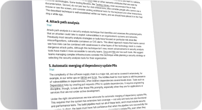Techniques 3. Accessibility-aware component test design Trial One of the many places in the software delivery process where accessibility requirements should be considered is during web component testing. While testing framework plugins like chai-a11y-axe provide assertions in their API to check for the basics, accessibility-aware component test design can further help to provide all the semantic elements screen readers and other assistive technologies require. First, instead of using test ids or classes to find and select the elements you want to validate, use a principle of identifying elements by ARIA roles or other semantic attributes that are used by assistive technologies. Some testing libraries, like Testing Library, even recommend this in their documentation. Second, do not just test for click interactions; also consider people who cannot use a mouse or see the screen, and consider adding additional tests for the keyboard and other interactions. The described technique is well established within our teams, and we should have placed it in the Trial ring a while ago. 4. Attack path analysis Trial Attack path analysis is a security analysis technique that identifies and assesses the potential paths that an attacker could take to exploit vulnerabilities in an organization’s systems and networks. Previously most security analysis strategies or tools have focused on particular risk areas like misconfigurations, vulnerable containers or CVE alerts. This siloed approach means that teams cannot see how risks can be combined with weaknesses in other layers of the technology stack to create dangerous attack paths. Although this technique isn’t new, recent advancements in security analysis tools have made it more accessible to security teams. Orca and Wiz are two such tools. We suggest teams managing complex infrastructures consider this technique while planning a security strategy or selecting the security analysis tools for their organization. 5. Automatic merging of dependency update PRs Trial The complexity of the software supply chain is a major risk, and we’ve covered it extensively, for example, in our write-ups on SBOM and SLSA. The Achilles heel for most teams is still the presence of vulnerabilities in dependencies, often indirect dependencies several levels down. Tools such as Dependabot help by creating pull requests (PRs) to update dependencies. It requires engineering discipline, though, to look after these PRs promptly, especially when they are for applications or services that are not under active development. Under the right circumstances we now advocate for automatic merging of dependency update PRs. This requires that the system has extensive test coverage — not only unit tests but also functional and performance tests. The build pipeline must run all of these tests, and it must include security scanning. In short, the team must have full confidence that when the pipeline runs successfully the software is ready to go into production. In such cases, dependency update PRs, even when they include major version updates in indirect dependencies, should be merged automatically. © Thoughtworks, Inc. All Rights Reserved. 13