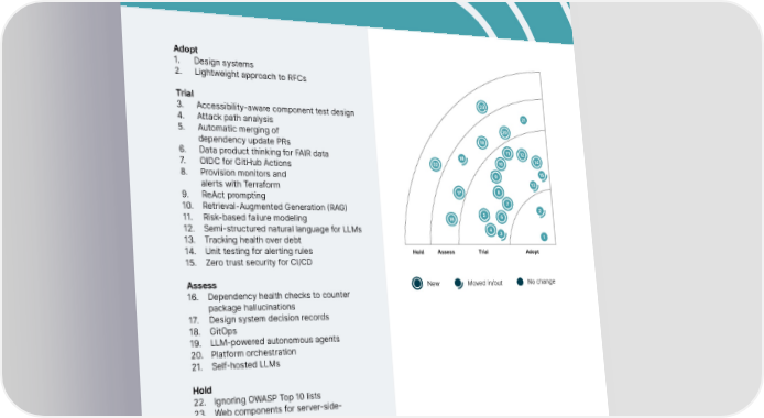 Techniques Adopt 1. Design systems 2. Lightweight approach to RFCs Trial 23 3. Accessibility-aware component test design 21 68 69 70 4. Attack path analysis 20 71 72 73 5. Automatic merging of 19 46 48 74 dependency update PRs 11 12 50 6. Data product thinking for FAIR data 18 14 53 75 22 10 47 55 76 7. OIDC for GitHub Actions 51 52 54 77 9 15 57 8. Provision monitors and 13 49 alerts with Terraform 58 60 78 17 8 56 79 9. ReAct prompting 7 59 61 63 10. Retrieval-Augmented Generation (RAG) 2 80 5 6 42 44 62 11. Risk-based failure modeling 16 43 64 81 12. Semi-structured natural language for LLMs 4 65 82 13. Tracking health over debt 3 1 45 66 67 14. Unit testing for alerting rules Hold Assess Trial Adopt Adopt Trial Assess Hold 15. Zero trust security for CI/CD 96 Assess New 25 No change 107 33 Moved in/out 94 95 16. Dependency health checks to counter 26 24 83 106 package hallucinations 34 93 17. Design system decision records 27 91 92 105 18. GitOps 35 28 88 90 89 104 19. LLM-powered autonomous agents 36 29 87 103 20. Platform orchestration 30 31 21. Self-hosted LLMs 37 32 84 102 85 86 101 Hold 38 39 100 22. Ignoring OWASP Top 10 lists 98 99 40 41 97 23. Web components for server-side- rendered (SSR) web apps © Thoughtworks, Inc. All Rights Reserved.