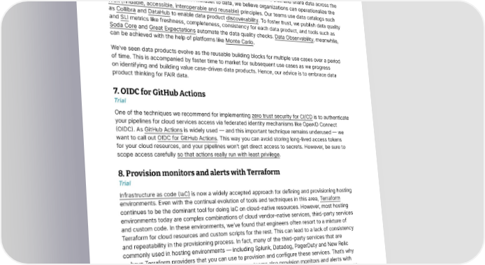 Techniques 6. Data product thinking for FAIR data Trial Data product thinking prioritizes treating data consumers as customers, ensuring they have a seamless experience across the data value chain. This encompasses ease of data discovery, understanding, trust, access and consumption. “Product thinking” is not a new concept. In the past we’ve embraced this in the operational world while building operational products or microservices. It also suggests a new way to build long-lived cross-functional teams to own and share data across the organization. By bringing a product mindset to data, we believe organizations can operationalize the FAIR (findable, accessible, interoperable and reusable) principles. Our teams use data catalogs such as Collibra and DataHub to enable data product discoverability. To foster trust, we publish data quality and SLI metrics like freshness, completeness, consistency for each data product, and tools such as Soda Core and Great Expectations automate the data quality checks. Data Observability, meanwhile, can be achieved with the help of platforms like Monte Carlo. We’ve seen data products evolve as the reusable building blocks for multiple use cases over a period of time. This is accompanied by faster time to market for subsequent use cases as we progress on identifying and building value case-driven data products. Hence, our advice is to embrace data product thinking for FAIR data. 7. OIDC for GitHub Actions Trial One of the techniques we recommend for implementing zero trust security for CI/CD is to authenticate your pipelines for cloud services access via federated identity mechanisms like OpenID Connect (OIDC). As GitHub Actions is widely used — and this important technique remains underused — we want to call out OIDC for GitHub Actions. This way you can avoid storing long-lived access tokens for your cloud resources, and your pipelines won’t get direct access to secrets. However, be sure to scope access carefully so that actions really run with least privilege. 8. Provision monitors and alerts with Terraform Trial Infrastructure as code (IaC) is now a widely accepted approach for defining and provisioning hosting environments. Even with the continual evolution of tools and techniques in this area, Terraform continues to be the dominant tool for doing IaC on cloud-native resources. However, most hosting environments today are complex combinations of cloud vendor–native services, third-party services and custom code. In these environments, we’ve found that engineers often resort to a mixture of Terraform for cloud resources and custom scripts for the rest. This can lead to a lack of consistency and repeatability in the provisioning process. In fact, many of the third-party services that are commonly used in hosting environments — including Splunk, Datadog, PagerDuty and New Relic — have Terraform providers that you can use to provision and configure these services. That’s why we recommend that, in addition to cloud resources, teams also provision monitors and alerts with Terraform. This leads to IaC with better modularity that is easier to understand and maintain. As with all IaC, there is a risk of introducing inconsistencies when the configuration is changed via other interfaces. To ensure that the Terraform code remains the source of truth, we recommend you disable configuration changes via user interfaces and APIs. © Thoughtworks, Inc. All Rights Reserved. 14