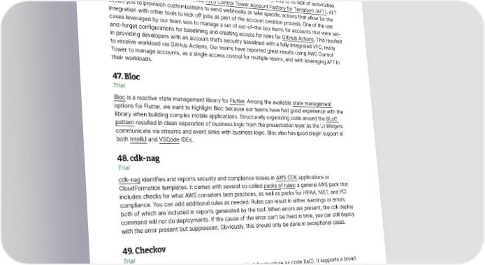 Tools 46. AWS Control Tower Trial Multi-team account management is a challenge in AWS, especially in setup and governance. AWS Control Tower addresses this challenge by simplifying setup and automating governance; it addresses regulatory requirements with guardrails. AWS Control Tower has a built-in Account Factory that helps automate the account provisioning workflow. Among other things, you can update, unmanage and close accounts that you create and provision through Account Factory. Due to its lack of automation and customization, Amazon introduced AWS Control Tower Account Factory for Terraform (AFT). AFT allows you to provision customizations to send webhooks or take specific actions that allow for the integration with other tools to kick off jobs as part of the account creation process. One of the use cases leveraged by our team was to manage a set of out-of-the box items for accounts that were set- and-forget configurations for baselining and creating access for roles for GitHub Actions. This resulted in providing developers with an account that’s security baselined with a fully integrated VPC, ready to receive workload via GitHub Actions. Our teams have reported great results using AWS Control Tower to manage accounts, as a single access control for multiple teams, and with leveraging AFT in their workloads. 47. Bloc Trial Bloc is a reactive state management library for Flutter. Among the available state management options for Flutter, we want to highlight Bloc because our teams have had good experience with the library when building complex mobile applications. Structurally organizing code around the BLoC pattern resulted in clean separation of business logic from the presentation layer as the UI Widgets communicate via streams and event sinks with business logic. Bloc also has good plugin support in both IntelliJ and VSCode IDEs. 48. cdk-nag Trial cdk-nag identifies and reports security and compliance issues in AWS CDK applications or CloudFormation templates. It comes with several so-called packs of rules: a general AWS pack that includes checks for what AWS considers best practices, as well as packs for HIPAA, NIST, and PCI compliance. You can add additional rules as needed. Rules can result in either warnings or errors, both of which are included in reports generated by the tool. When errors are present, the cdk deploy command will not do deployments. If the cause of the error can’t be fixed in time, you can still deploy with the error present but suppressed. Obviously, this should only be done in exceptional cases. 49. Checkov Trial Checkov is a specialized static security scanner for infrastructure as code (IaC). It supports a broad array of infra languages, including Kubernetes manifests, Helm charts, CloudFormation templates and Terraform. Easily deployable in CI/CD pipelines, it safeguards against potential security gaps in diverse cloud infrastructure configurations. Leveraging a set of default rules, it identifies common security scenarios with detailed remediation advice available on its website. Checkov supports custom rules and uses YAML for simple guideline definitions or Python for crafting more complex ones. Our teams have successfully used Checkov to enhance security during infrastructure deployments, appreciating the early warnings it provides on potential issues before deployment. © Thoughtworks, Inc. All Rights Reserved. 28