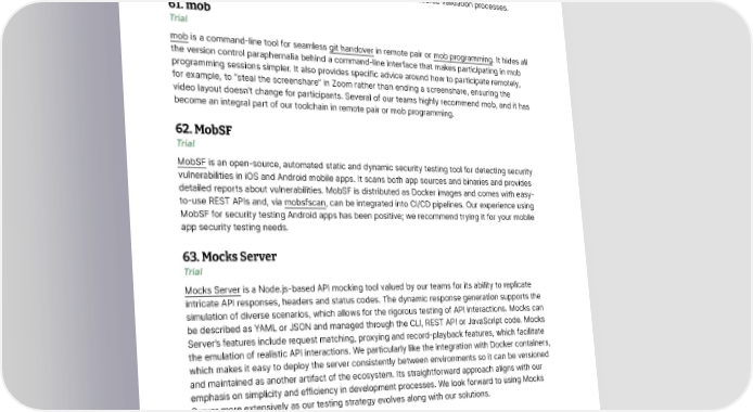 Tools 60. Kubeconform Trial Kubeconform is a streamlined tool for validating Kubernetes manifests and custom resource definitions (CRD). Easily deployable in CI/CD pipelines or local machine setups, it fosters confidence by validating resources prior to deployment, thereby mitigating potential errors. Given its track record in enhancing operational assurance, especially with templated resources shared across teams, we recommend trialing Kubeconform to bolster the security and efficiency of your resource validation processes. 61. mob Trial mob is a command-line tool for seamless git handover in remote pair or mob programming. It hides all the version control paraphernalia behind a command-line interface that makes participating in mob programming sessions simpler. It also provides specific advice around how to participate remotely, for example, to “steal the screenshare” in Zoom rather than ending a screenshare, ensuring the video layout doesn’t change for participants. Several of our teams highly recommend mob, and it has become an integral part of our toolchain in remote pair or mob programming. 62. MobSF Trial MobSF is an open-source, automated static and dynamic security testing tool for detecting security vulnerabilities in iOS and Android mobile apps. It scans both app sources and binaries and provides detailed reports about vulnerabilities. MobSF is distributed as Docker images and comes with easy- to-use REST APIs and, via mobsfscan, can be integrated into CI/CD pipelines. Our experience using MobSF for security testing Android apps has been positive; we recommend trying it for your mobile app security testing needs. 63. Mocks Server Trial Mocks Server is a Node.js-based API mocking tool valued by our teams for its ability to replicate intricate API responses, headers and status codes. The dynamic response generation supports the simulation of diverse scenarios, which allows for the rigorous testing of API interactions. Mocks can be described as YAML or JSON and managed through the CLI, REST API or JavaScript code. Mocks Server’s features include request matching, proxying and record-playback features, which facilitate the emulation of realistic API interactions. We particularly like the integration with Docker containers, which makes it easy to deploy the server consistently between environments so it can be versioned and maintained as another artifact of the ecosystem. Its straightforward approach aligns with our emphasis on simplicity and efficiency in development processes. We look forward to using Mocks Server more extensively as our testing strategy evolves along with our solutions. © Thoughtworks, Inc. All Rights Reserved. 32
