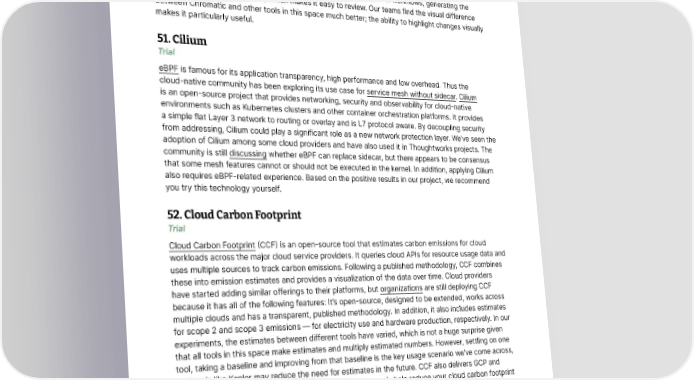 Tools 50. Chromatic Trial Chromatic is a visual regression testing tool to help catch UI regression in web applications. It works by taking snapshots of UI components and comparing them against previous snapshots when they change. It’s a hosted service that integrates with popular cloud code hosting services. Built on top of Storybook, it does component-level visual regression testing. It can render the components in different viewport widths for responsive testing and integrates with CI workflows, generating the UI changeset for every commit, which makes it easy to review. Our teams find the visual difference between Chromatic and other tools in this space much better; the ability to highlight changes visually makes it particularly useful. 51. Cilium Trial eBPF is famous for its application transparency, high performance and low overhead. T hus the cloud-native community has been exploring its use case for service mesh without sidecar. Cilium is an open-source project that provides networking, security and observability for cloud-native environments such as Kubernetes clusters and other container orchestration platforms. It provides a simple flat Layer 3 network to routing or overlay and is L7 protocol aware. By decoupling security from addressing, Cilium could play a significant role as a new network protection layer. We’ve seen the adoption of Cilium among some cloud providers and have also used it in Thoughtworks projects. The community is still discussing whether eBPF can replace sidecar, but there appears to be consensus that some mesh features cannot or should not be executed in the kernel. In addition, applying Cilium also requires eBPF-related experience. Based on the positive results in our project, we recommend you try this technology yourself. 52. Cloud Carbon Footprint Trial Cloud Carbon Footprint (CCF) is an open-source tool that estimates carbon emissions for cloud workloads across the major cloud service providers. It queries cloud APIs for resource usage data and uses multiple sources to track carbon emissions. Following a published methodology, CCF combines these into emission estimates and provides a visualization of the data over time. Cloud providers have started adding similar offerings to their platforms, but organizations are still deploying CCF because it has all of the following features: It’s open-source, designed to be extended, works across multiple clouds and has a transparent, published methodology. In addition, it also includes estimates for scope 2 and scope 3 emissions — for electricity use and hardware production, respectively. In our experiments, the estimates between different tools have varied, which is not a huge surprise given that all tools in this space make estimates and multiply estimated numbers. However, settling on one tool, taking a baseline and improving from that baseline is the key usage scenario we’ve come across, and tools like Kepler may reduce the need for estimates in the future. CCF also delivers GCP and AWS-sourced optimization recommendations, which not only help reduce your cloud carbon footprint but can also become part of a wider cloud cost optimization strategy. Thoughtworks is a significant contributor to CCF. © Thoughtworks, Inc. All Rights Reserved. 29