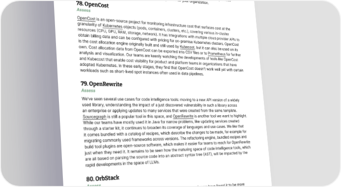 Tools We’ve used StarCoder in our experiments and found it to be useful for generating structured software engineering elements such as code, YAML, SQL and JSON. Based on our experiments, we found both the models to be receptive to in-context learning using few-shot examples in the prompt. Nonetheless, for specific downstream tasks (such as SQL generation for a specific database like Postgres) the models needed fine-tuning. Recently, Meta unveiled its Code Llama, a code-specialized version of Llama 2. Be sure to proceed with caution when using these open-source models. Consider their license, the license of the code and of the data set used to train the model. Carefully assess these aspects before you choose any of these coding LLMs for your organization. 78. OpenCost Assess OpenCost is an open-source project for monitoring infrastructure cost that surfaces cost at the granularity of Kubernetes objects (pods, containers, clusters, etc.), covering various in-cluster resources (CPU, GPU, RAM, storage, network). It has integrations with multiple cloud provider APIs to obtain billing data and can be configured with pricing for on-premise Kubernetes clusters. OpenCost is the cost allocation engine originally built and still used by Kubecost, but it can also be used on its own. Cost allocation data from OpenCost can be exported into CSV files or to Prometheus for further analysis and visualization. Our teams are keenly watching the developments of tools like OpenCost and Kubecost that enable cost visibility for product and platform teams in organizations that have adopted Kubernetes. In these early stages, they find that OpenCost doesn’t work well yet with certain workloads such as short-lived spot instances often used in data pipelines. 79. OpenRewrite Assess We’ve seen several use cases for code intelligence tools: moving to a new API version of a widely used library, understanding the impact of a just discovered vulnerability in such a library across an enterprise or applying updates to many services that were created from the same template. Sourcegraph is still a popular tool in this space, and OpenRewrite is another tool we want to highlight. While our teams have mostly used it in Java for narrow problems, like updating services created through a starter kit, it continues to broaden its coverage of languages and use cases. We like that it comes bundled with a catalog of recipes, which describe the changes to be made, for example for migrating commonly used frameworks across versions. The refactoring engine, bundled recipes and build tool plugins are open-source software, which makes it easier for teams to reach for OpenRewrite just when they need it. It remains to be seen how the maturing space of code intelligence tools, which are all based on parsing the source code into an abstract syntax tree (AST), will be impacted by the rapid developments in the space of LLMs. 80. OrbStack Assess OrbStack is a way to run Docker containers on macOS; our developers have found it to be more lightweight, faster and simpler to set up and use than Docker Desktop and Colima. The tool is still under development and therefore has fewer features, but it’s already showing some great potential with its simplicity and speed. You can also use OrbStack to create and manage Linux VMs on macOS. © Thoughtworks, Inc. All Rights Reserved. 37