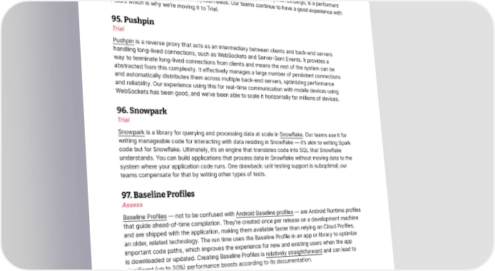 Languages and Frameworks 94. Polars Trial Polars is an in-memory data frame library implemented in Rust. Unlike other data frames (such as pandas), Polars is multithreaded, supports lazy execution and is safe for parallel operations. The in- memory data is organized in the Apache Arrow format for efficient analytic operations and to enable interoperability with other tools. If you’re familiar with pandas, you can quickly get started with Polars’ Python bindings. We believe Polars, with Rust implementation and Python bindings, is a performant in-memory data frame for your analytical needs. Our teams continue to have a good experience with Polars which is why we’re moving it to Trial. 95. Pushpin Trial Pushpin is a reverse proxy that acts as an intermediary between clients and back-end servers handling long-lived connections, such as WebSockets and Server-Sent Events. It provides a way to terminate long-lived connections from clients and means the rest of the system can be abstracted from this complexity. It effectively manages a large number of persistent connections and automatically distributes them across multiple back-end servers, optimizing performance and reliability. Our experience using this for real-time communication with mobile devices using WebSockets has been good, and we’ve been able to scale it horizontally for millions of devices. 96. Snowpark Trial Snowpark is a library for querying and processing data at scale in Snowflake. Our teams use it for writing manageable code for interacting with data residing in Snowflake — it’s akin to writing Spark code but for Snowflake. Ultimately, it’s an engine that translates code into SQL that Snowflake understands. You can build applications that process data in Snowflake without moving data to the system where your application code runs. One drawback: unit testing support is suboptimal; our teams compensate for that by writing other types of tests. 97. Baseline Profiles Assess Baseline Profiles — not to be confused with Android Baseline profiles — are Android Runtime profiles that guide ahead-of-time compilation. They’re created once per release on a development machine and are shipped with the application, making them available faster than relying on Cloud Profiles, an older, related technology. The run time uses the Baseline Profile in an app or library to optimize important code paths, which improves the experience for new and existing users when the app is downloaded or updated. Creating Baseline Profiles is relatively straightforward and can lead to significant (up to 30%) performance boosts according to its documentation. © Thoughtworks, Inc. All Rights Reserved. 43
