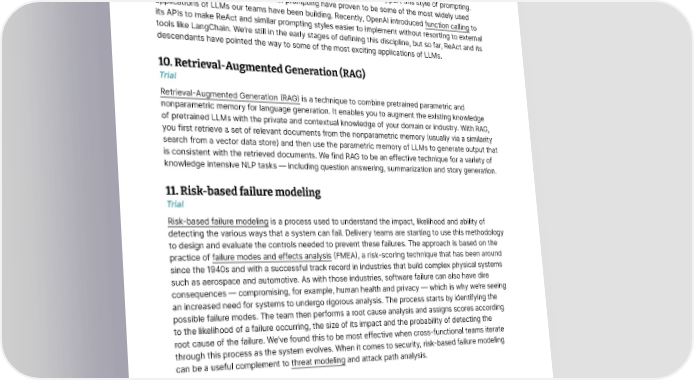 Techniques 9. ReAct prompting Trial ReAct prompting is a method for prompting LLMs intended to improve the accuracy of their responses over competing methods such as chain-of-thought (CoT). Introduced in a 2022 paper, it works by bringing together reasoning and action (hence ReAct). Such an approach helps make LLM responses more explainable and reduces hallucinations compared to CoT, giving prompters a better chance of getting what they want. LangChain was originally developed to support this style of prompting. Autonomous agents based on ReAct prompting have proven to be some of the most widely used applications of LLMs our teams have been building. Recently, OpenAI introduced function calling to its APIs to make ReAct and similar prompting styles easier to implement without resorting to external tools like LangChain. We’re still in the early stages of defining this discipline, but so far, ReAct and its descendants have pointed the way to some of the most exciting applications of LLMs. 10. Retrieval-Augmented Generation (RAG) Trial Retrieval-Augmented Generation (RAG) is a technique to combine pretrained parametric and nonparametric memory for language generation. It enables you to augment the existing knowledge of pretrained LLMs with the private and contextual knowledge of your domain or industry. With RAG, you first retrieve a set of relevant documents from the nonparametric memory (usually via a similarity search from a vector data store) and then use the parametric memory of LLMs to generate output that is consistent with the retrieved documents. We find RAG to be an effective technique for a variety of knowledge intensive NLP tasks — including question answering, summarization and story generation. 11. Risk-based failure modeling Trial Risk-based failure modeling is a process used to understand the impact, likelihood and ability of detecting the various ways that a system can fail. Delivery teams are starting to use this methodology to design and evaluate the controls needed to prevent these failures. The approach is based on the practice of failure modes and effects analysis (FMEA), a risk-scoring technique that has been around since the 1940s and with a successful track record in industries that build complex physical systems such as aerospace and automotive. As with those industries, software failure can also have dire consequences — compromising, for example, human health and privacy — which is why we’re seeing an increased need for systems to undergo rigorous analysis. The process starts by identifying the possible failure modes. The team then performs a root cause analysis and assigns scores according to the likelihood of a failure occurring, the size of its impact and the probability of detecting the root cause of the failure. We’ve found this to be most effective when cross-functional teams iterate through this process as the system evolves. When it comes to security, risk-based failure modeling can be a useful complement to threat modeling and attack path analysis. 12. Semi-structured natural language for LLMs Trial We’ve had success in various applications using a semi-structured natural language for LLMs. Structured inputs, such as a JSON document, are clear and precise and give the model an indication of the type of response being sought. Constraining the response in this way helps narrow the problem space and can produce more accurate completions, particularly when the structure conforms to a © Thoughtworks, Inc. All Rights Reserved. 15