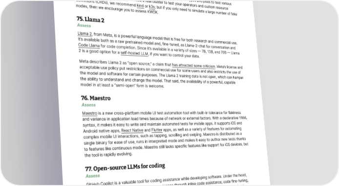 Tools 74. KWOK Assess KWOK (Kubernetes WithOut Kubelet) is a tool for simulating the lifecycle of fake nodes and pods in order to test the control plane of a Kubernetes cluster. It is difficult to stress test custom Kubernetes controllers and operators without a significantly large cluster. However, with KWOK you can easily set up a cluster with thousands of nodes on your laptop without it consuming a significant amount of CPU or memory. This simulation enables different configurations of node types and pods to test various scenarios and edge cases. If you need a real cluster to test your operators and custom resource definitions (CRDs), we recommend kind or k3s; but if you only need to simulate a large number of fake nodes, then we encourage you to assess KWOK. 75. Llama 2 Assess Llama 2, from Meta, is a powerful language model that is free for both research and commercial use. It’s available both as a raw pretrained model and, fine-tuned, as Llama-2-chat for conversation and Code Llama for code completion. Since it’s available in a variety of sizes — 7B, 13B, and 70B — Llama 2 is a good option for a self-hosted LLM, if you want to control your data. Meta describes Llama 2 as “open source,” a claim that has attracted some criticism. Meta’s license and acceptable use policy put restrictions on commercial use for some users and also restricts the use of the model and software for certain purposes. The Llama 2 training data is not open, which can hamper the ability to understand and change the model. That said, the availability of a powerful, capable model in at least a “semi-open” form is welcome. 76. Maestro Assess Maestro is a new cross-platform mobile UI test automation tool with built-in tolerance for flakiness and variance in application load times because of network or external factors. With a declarative YAML syntax, it makes it easy to write and maintain automated tests for mobile apps. It supports iOS and Android native apps, React Native and Flutter apps, as well as a variety of features for automating complex mobile UI interactions, such as tapping, scrolling and swiping. Maestro is distributed as a single binary for ease of use, runs in interpreted mode and makes it easy to author new tests thanks to features like continuous mode. Maestro still lacks specific features like support for iOS devices, but the tool is rapidly evolving. 77. Open-source LLMs for coding Assess GitHub Copilot is a valuable tool for coding assistance while developing software. Under the hood, LLMs can power seamless developer experiences through inline code assistance, code fine-tuning, conversational support in the IDE and much more. Most of these models are proprietary and can only be used via subscription services. The good news is you can use several open-source LLMs for coding. If you’re in a space where you need to build your own coding assistance service (such as a highly regulated industry), look at models like StarCoder and WizardCoder. StarCoder is trained with a large data set maintained by BigCode, and Wizardcoder is an Evol-Instruct tuned StarCoder model. © Thoughtworks, Inc. All Rights Reserved. 36