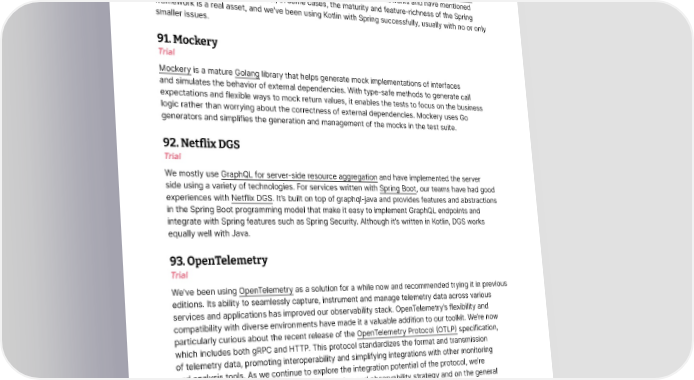 Languages and Frameworks 90. Kotlin with Spring Trial Five years ago we moved Kotlin into the Adopt ring, and today many of our teams report that Kotlin is not only their default choice on the JVM but that it has displaced Java almost completely in the software they write. At the same time, microservice envy appears to be fading — we’ve noticed people starting to explore architectures with larger deployable units, using frameworks like Spring Modulith among others. We’re aware of many good Kotlin-native frameworks and have mentioned some of them previously; however, in some cases, the maturity and feature-richness of the Spring framework is a real asset, and we’ve been using Kotlin with Spring successfully, usually with no or only smaller issues. 91. Mockery Trial Mockery is a mature Golang library that helps generate mock implementations of interfaces and simulates the behavior of external dependencies. With type-safe methods to generate call expectations and flexible ways to mock return values, it enables the tests to focus on the business logic rather than worrying about the correctness of external dependencies. Mockery uses Go generators and simplifies the generation and management of the mocks in the test suite. 92. Net昀氀ix DGS Trial We mostly use GraphQL for server-side resource aggregation and have implemented the server side using a variety of technologies. For services written with Spring Boot, our teams have had good experiences with Netflix DGS. It’s built on top of graphql-java and provides features and abstractions in the Spring Boot programming model that make it easy to implement GraphQL endpoints and integrate with Spring features such as Spring Security. Although it’s written in Kotlin, DGS works equally well with Java. 93. OpenTelemetry Trial We’ve been using OpenTelemetry as a solution for a while now and recommended trying it in previous editions. Its ability to seamlessly capture, instrument and manage telemetry data across various services and applications has improved our observability stack. OpenTelemetry’s flexibility and compatibility with diverse environments have made it a valuable addition to our toolkit. We’re now particularly curious about the recent release of the OpenTelemetry Protocol (OTLP) specification, which includes both gRPC and HTTP. This protocol standardizes the format and transmission of telemetry data, promoting interoperability and simplifying integrations with other monitoring and analysis tools. As we continue to explore the integration potential of the protocol, we’re evaluating its long-term impact on our monitoring and observability strategy and on the general monitoring landscape. © Thoughtworks, Inc. All Rights Reserved. 42