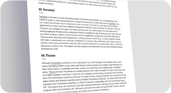 Tools 64. Prisma runtime defense Trial Prisma runtime defense, which is a part of the Prisma Cloud suite, offers a new approach to container security. It employs a mechanism to build a model of a container’s expected behavior, and then detects and blocks anomalous activities when some variance is found during the run time. It monitors container processes, network activities and file systems for patterns and changes that indicate an attack might be underway and blocks according to the configured rules. The models that learn what constitutes “normal” behaviors are built from both the static analysis of docker images and dynamic behavioral analysis for a preconfigured period. Our teams have found the results from our usage promising. 65. Terratest Trial Terratest continues to be an interesting option for infrastructure testing. It is a Golang library that makes it easier to write automated tests. Using infrastructure-as-code tools such as Terraform, you can create real infrastructure components (such as servers, firewalls or load balancers) to deploy applications on them and then validate the expected behavior using Terratest. At the end of the test, Terratest can undeploy the apps and clean up resources. Our teams report that this approach of testing deployed infrastructure components fosters confidence in the infrastructure as code. We see our teams writing a variety of infra security tests for application components and their integrations. These include detecting misconfigurations, verifying access control (e.g., to check whether certain IAM roles or permissions are correctly configured or to ensure only authorized users have access to specific resources) and network security tests to verify prevention of unauthorized traffic to sensitive resources to name a few. This allows security testing to be shifted left and provides feedback during development itself. 66. Thanos Trial Although Prometheus continues to be a solid option for a self-managed observability stack, many teams managing modern cloud-native distributed systems bump into its single-node limitations as their metrics grow in cardinality and sheer volume, and when they start needing high-availability setup. Thanos extends Prometheus by adding features that make it suitable for large-scale, long-term and highly available monitoring. It does this, for example, by introducing components that will read data from Prometheus instances and store it in object stores, manage retention and compaction in the object stores and federate querying across multiple Prometheus instances. Our teams have found the migration from Prometheus seamless, as Thanos maintains compatibility with the Prometheus query API. This means they can continue to use their existing dashboards, alerting tools and other tools that integrate with the Prometheus API. Although our teams have been successful with Thanos, we also recommend keeping an eye on Cortex, as another way to extend Prometheus. © Thoughtworks, Inc. All Rights Reserved. 33