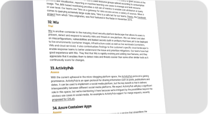 Platforms 31. Trino Trial Trino, previously known as PrestoSQL, is an open-source, distributed SQL query engine designed for interactive analytic queries over big data. It is optimized to run both on-premise and in the cloud. It supports querying data where it lives, including Hive, Cassandra, relational databases and even proprietary data stores. For authentication mechanisms, it supports password-based authentication, LDAP and OAuth. For authorization and access control, Trino provides the ability to grant access at the catalog, schema and table levels. Our teams used resource groups spliced according to consumption patterns like visualization, reporting or machine learning use cases to manage and limit resource usage. The JMX-based monitoring provides a rich set of metrics to enable cost attribution at query or user level. Our teams use Trino as a gateway for data access across a variety of sources. When it comes to querying extremely large-scale data, Trino is a safe bet for our teams. Presto, the Facebook project from which Trino originates, was first featured in the Radar in November 2015. 32. Wiz Trial Wiz is another contender in the maturing cloud security platform landscape that allows its users to prevent, detect and respond to security risks and threats in one platform. Wiz can detect and alert on misconfigurations, vulnerabilities and leaked secrets both in artifacts that have yet to be deployed to live environments (container images, infrastructure code) as well as live workloads (containers, VMs and cloud services). It also contextualizes findings to the customer’s specific cloud landscape to enable response teams to better understand the issue and prioritize mitigations. Our teams have had good experience with Wiz. They find that Wiz is rapidly evolving and adding new features, and they appreciate that it enables them to detect risks and threats sooner than some other similar tools as it continuously scans for changes. 33. ActivityPub Assess With the current upheaval in the micro-blogging platform space, the ActivityPub protocol is gaining prominence. ActivityPub is an open protocol for sharing information such as posts, publications and dates. It can be used to implement a social media platform, but the key benefit is that it delivers interoperability between different social media platforms. We expect ActivityPub will play a significant role in this space, but we’re mentioning it here because we’re intrigued by the possibilities beyond the obvious use cases in social media. An example is ActivityPub support for merge requests, recently proposed for GitLab. 34. Azure Container Apps Assess Azure Container Apps is a managed Kubernetes namespace as a service that streamlines the deployment of containerized workloads by eliminating the need for intricate maintenance of Kubernetes clusters and underlying infrastructure components, consequently diminishing operational and administrative burdens. However, it’s essential to tread carefully while considering this option; currently in its developmental phase, it has exhibited inconsistencies in the Azure portal’s representation of its capabilities and encounters integration hurdles, particularly with the standard Terraform provider for Azure lagging in mirroring the tool’s actual functionalities. Given all this, we recommend assessing this tool carefully. © Thoughtworks, Inc. All Rights Reserved. 23