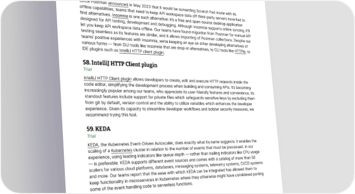 Tools We’re also excited that Copilot’s chat feature from the Copilot X roadmap has become more widely available since we last featured it in the Radar. It is a powerful addition to Copilot’s in-line assistance feature. The availability of a chat interface inside the IDE improves the discoverability of commonly searched information, and integration with the open editor context makes it easy to explore errors or ask the chat to assist with tasks related to the code in focus. 57. Insomnia Trial Since Postman announced in May 2023 that it would be sunsetting Scratch Pad mode with its offline capabilities, teams that need to keep API workspace data off third-party servers have had to find alternatives. Insomnia is one such alternative: it’s a free and open-source desktop application designed for API testing, development and debugging. Although Insomnia supports online syncing, it’ll let you keep API workspace data offline. Our teams have found migration from Postman for manual API testing seamless as its features are similar, and it allows importing of Postman collections. Despite our teams’ positive experiences with Insomnia, we’re keeping an eye on other developing alternatives of various forms — from GUI tools like Insomnia that are drop-in alternatives, to CLI tools like HTTPie, to IDE plugins such as IntelliJ HTTP client plugin. 58. IntelliJ HTTP Client plugin Trial IntelliJ HTTP Client plugin allows developers to create, edit and execute HTTP requests inside the code editor, simplifying the development process when building and consuming APIs. It’s becoming increasingly popular among our teams, who appreciate its user-friendly features and convenience. Its standout features include support for private files which safeguards sensitive keys by excluding them from git by default, version control and the ability to utilize variables which enhances the developer experience. Given its capacity to streamline developer workflows and bolster security measures, we recommend trying this tool. 59. KEDA Trial KEDA, the Kubernetes Event-Driven Autoscaler, does exactly what its name suggests: it enables the scaling of a Kubernetes cluster in relation to the number of events that must be processed. In our experience, using leading indicators like queue depth — rather than trailing indicators like CPU usage — is preferable. KEDA supports different event sources and comes with a catalog of more than 50 scalers for various cloud platforms, databases, messaging systems, telemetry systems, CI/CD systems and more. Our teams report that the ease with which KEDA can be integrated has allowed them to keep functionality in microservices in Kubernetes where they otherwise might have considered porting some of the event handling code to serverless functions. © Thoughtworks, Inc. All Rights Reserved. 31