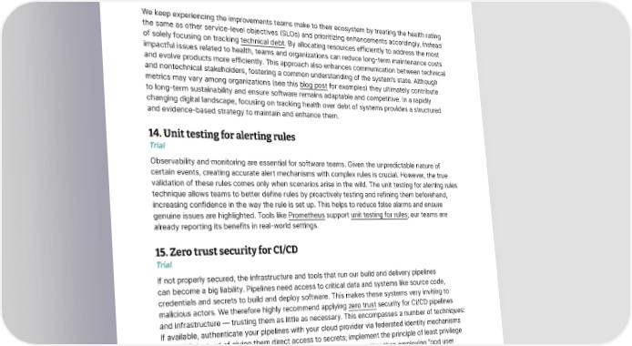 Techniques domain-specific language (DSL) whose syntax or schema is provided to the model. We’ve also found that augmenting the structured input with natural language comments or notations produces a better response than either natural language or structured input alone. Typically, natural language is simply interspersed with structured content when constructing the prompt. As with many LLM behaviors, we don’t know exactly why this works, but our experience shows that putting natural language comments in human-written code also improves the quality of output for LLM-based coding assistants. 13. Tracking health over debt Trial We keep experiencing the improvements teams make to their ecosystem by treating the health rating the same as other service-level objectives (SLOs) and prioritizing enhancements accordingly, instead of solely focusing on tracking technical debt. By allocating resources efficiently to address the most impactful issues related to health, teams and organizations can reduce long-term maintenance costs and evolve products more efficiently. This approach also enhances communication between technical and nontechnical stakeholders, fostering a common understanding of the system’s state. Although metrics may vary among organizations (see this blog post for examples) they ultimately contribute to long-term sustainability and ensure software remains adaptable and competitive. In a rapidly changing digital landscape, focusing on tracking health over debt of systems provides a structured and evidence-based strategy to maintain and enhance them. 14. Unit testing for alerting rules Trial Observability and monitoring are essential for software teams. Given the unpredictable nature of certain events, creating accurate alert mechanisms with complex rules is crucial. However, the true validation of these rules comes only when scenarios arise in the wild. The unit testing for alerting rules technique allows teams to better define rules by proactively testing and refining them beforehand, increasing confidence in the way the rule is set up. This helps to reduce false alarms and ensure genuine issues are highlighted. Tools like Prometheus support unit testing for rules; our teams are already reporting its benefits in real-world settings. 15. Zero trust security for CI/CD Trial If not properly secured, the infrastructure and tools that run our build and delivery pipelines can become a big liability. Pipelines need access to critical data and systems like source code, credentials and secrets to build and deploy software. This makes these systems very inviting to malicious actors. We therefore highly recommend applying zero trust security for CI/CD pipelines and infrastructure — trusting them as little as necessary. This encompasses a number of techniques: If available, authenticate your pipelines with your cloud provider via federated identity mechanisms like OIDC, instead of giving them direct access to secrets; implement the principle of least privilege by minimizing the access of individual user or runner accounts, rather than employing “god user accounts” with unlimited access; use your runners in an ephemeral way instead of reusing them, to reduce the risk of exposing secrets from previous jobs or running jobs on compromised runners; keep the software in your agents and runners up to date; monitor the integrity, confidentiality and availability of your CI/CD systems the same way you would monitor your production software. © Thoughtworks, Inc. All Rights Reserved. 16