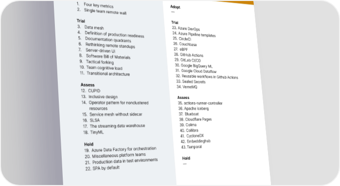 Thoughtworks Technology Radar The Radar Techniques Platforms Adopt Adopt 1. Four key metrics — 2. Single team remote wall Trial Trial 23. Azure DevOps 3. Data mesh 24. Azure Pipeline templates 4. Definition of production readiness 25. CircleCI 5. Documentation quadrants 26. Couchbase 6. Rethinking remote standups 27. eBPF 7. Server-driven UI 28. GitHub Actions 8. Software Bill of Materials 29. GitLab CI/CD 9. Tactical forking 30. Google BigQuery ML 10. Team cognitive load 31. Google Cloud Dataflow 11. Transitional architecture 32. Reusable workflows in Github Actions 33. Sealed Secrets Assess 34. VerneMQ 12. CUPID 13. Inclusive design Assess 14. Operator pattern for nonclustered 35. actions-runner-controller resources 36. Apache Iceberg 15. Service mesh without sidecar 37. Blueboat 16. SLSA 38. Cloudflare Pages 17. The streaming data warehouse 39. Colima 18. TinyML 40. Collibra 41. CycloneDX Hold 42. Embeddinghub 19. Azure Data Factory for orchestration 43. Temporal 20. Miscellaneous platform teams 21. Production data in test environments Hold 22. SPA by default — © Thoughtworks, Inc. All Rights Reserved.