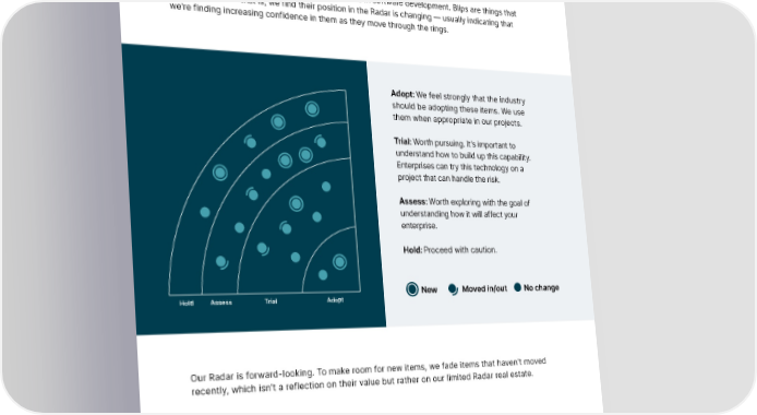 Thoughtworks Technology Radar Radar at a glance The Radar is all about tracking interesting things, which we refer to as blips. We organize the blips in the Radar using two categorizing elements: quadrants and rings. The quadrants represent different kinds of blips. The rings indicate what stage in an adoption lifecycle we think they should be in. A blip is a technology or technique that plays a role in software development. Blips are things that are “in motion” — that is, we find their position in the Radar is changing — usually indicating that we’re finding increasing confidence in them as they move through the rings. Adopt: We feel strongly that the industry should be adopting these items. We use them when appropriate in our projects. Trial: Worth pursuing. It’s important to understand how to build up this capability. Enterprises can try this technology on a project that can handle the risk. Assess: Worth exploring with the goal of understanding how it will affect your enterprise. Hold: Proceed with caution. New Moved in/out No change HoldAssess TrialAdopt Our Radar is forward-looking. To make room for new items, we fade items that haven’t moved recently, which isn’t a reflection on their value but rather on our limited Radar real estate. © Thoughtworks, Inc. All Rights Reserved. 4
