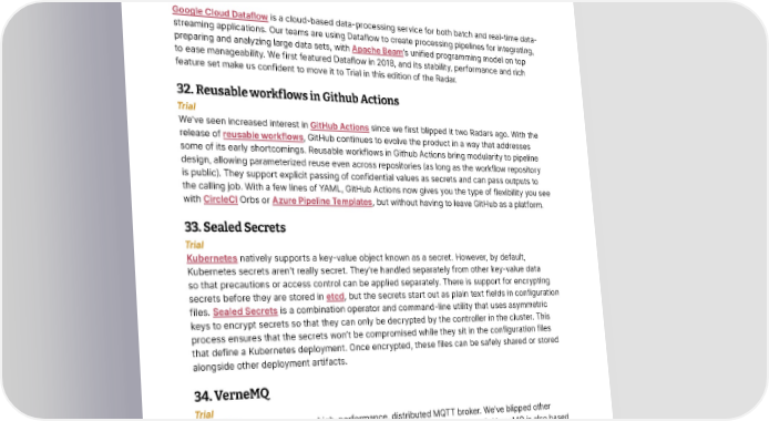 Platforms Thoughtworks Technology Radar of our concerns previously was explainability. Earlier this year, BigQuery Explainable AI was announced for general availability, taking a step in addressing this. We can also export BigQuery ML models to Cloud Storage as a Tensorflow SavedModel and use them for online prediction. There remain trade-offs like ease of “continuous delivery for machine learning” but with its low barrier to entry, BigQuery ML remains an attractive option, particularly when the data already resides in BigQuery. 31. Google Cloud Dataflow Trial Google Cloud Dataflow is a cloud-based data-processing service for both batch and real-time data- streaming applications. Our teams are using Dataflow to create processing pipelines for integrating, preparing and analyzing large data sets, with Apache Beam’s unified programming model on top to ease manageability. We first featured Dataflow in 2018, and its stability, performance and rich feature set make us confident to move it to Trial in this edition of the Radar. 32. Reusable workflows in Github Actions Trial We’ve seen increased interest in GitHub Actions since we first blipped it two Radars ago. With the release of reusable workflows, GitHub continues to evolve the product in a way that addresses some of its early shortcomings. Reusable workflows in Github Actions bring modularity to pipeline design, allowing parameterized reuse even across repositories (as long as the workflow repository is public). They support explicit passing of confidential values as secrets and can pass outputs to the calling job. With a few lines of YAML, GitHub Actions now gives you the type of flexibility you see with CircleCI Orbs or Azure Pipeline Templates, but without having to leave GitHub as a platform. 33. Sealed Secrets Trial Kubernetes natively supports a key-value object known as a secret. However, by default, Kubernetes secrets aren’t really secret. They’re handled separately from other key-value data so that precautions or access control can be applied separately. There is support for encrypting secrets before they are stored in etcd, but the secrets start out as plain text fields in configuration files. Sealed Secrets is a combination operator and command-line utility that uses asymmetric keys to encrypt secrets so that they can only be decrypted by the controller in the cluster. This process ensures that the secrets won’t be compromised while they sit in the configuration files that define a Kubernetes deployment. Once encrypted, these files can be safely shared or stored alongside other deployment artifacts. 34. VerneMQ Trial VerneMQ is an open-source, high-performance, distributed MQTT broker. We’ve blipped other MQTT brokers in the past like Mosquitto and EMQ. Like EMQ and RabbitMQ, VerneMQ is also based on Erlang/OTP which makes it highly scalable. It scales horizontally and vertically on commodity hardware to support a high number of concurrent publishers and consumers while maintaining low latency and fault tolerance. In our internal benchmarks, we’ve been able to achieve a few million concurrent connections in a single cluster. While it’s not new, we’ve used it in production for some time now, and it has worked well for us. © Thoughtworks, Inc. All Rights Reserved. 22