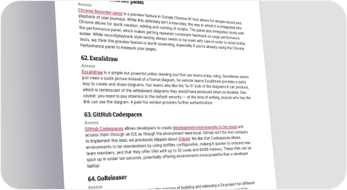 Tools Thoughtworks Technology Radar pushes that up a bit further, but more and more often our teams find themselves longing for the abstractions afforded by modern programming languages. Cloud Development Kit for Terraform (CDKTF), which resulted from a collaboration between AWS’s CDK team and Hashicorp, makes it possible for teams to use several programming languages, including TypeScript and Java, to define and provision infrastructure. With this approach it follows the lead of Pulumi while remaining in the Terraform ecosystem. We’ve had good experiences with CDKTF but have decided to keep it in the Assess ring until it moves out of beta. 61. Chrome Recorder panel Assess Chrome Recorder panel is a preview feature in Google Chrome 97 that allows for simple record and playback of user journeys. While this definitely isn’t a new idea, the way in which it is integrated into Chrome allows for quick creation, editing and running of scripts. The panel also integrates nicely with the performance panel, which makes getting repeated consistent feedback on page performance easier. While record/playback style testing always needs to be used with care in order to avoid brittle tests, we think this preview feature is worth assessing, especially if you’re already using the Chrome Performance panel to measure your pages. 62. Excalidraw Assess Excalidraw is a simple but powerful online drawing tool that our teams enjoy using. Sometimes teams just need a quick picture instead of a formal diagram, for remote teams Excalidraw provides a quick way to create and share diagrams. Our teams also like the “lo-fi” look of the diagrams it can produce, which is reminiscent of the whiteboard diagrams they would have produced when co-located. One caveat: you need to pay attention to the default security — at the time of writing, anyone who has the link can see the diagram. A paid-for version provides further authentication. 63. GitHub Codespaces Assess GitHub Codespaces allows developers to create development environments in the cloud and access them through an IDE as though the environment were local. GitHub isn’t the first company to implement this idea; we previously blipped about Gitpod. We like that Codespaces allows environments to be standardized by using dotfiles configuration, making it quicker to onboard new team members, and that they offer VMs with up to 32 cores and 64GB memory. These VMs can be spun up in under ten seconds, potentially offering environments more powerful than a developer laptop. 64. GoReleaser Assess GoReleaser is a tool that automates the process of building and releasing a Go project for different architectures via multiple repositories and channels, a common need for Go projects targeting different platforms. You run the tool either from your local machine or via CI, with the tool available via several CI services thus minimizing set-up and maintenance. GoReleaser takes care of build, packaging, publishing and announcement of each release and supports different combinations of package format, package repository and source control. Although it’s been around for a few years, we’re surprised that more teams are not using it. If you’re regularly releasing a Go codebase, this tool is worth assessing. © Thoughtworks, Inc. All Rights Reserved. 30