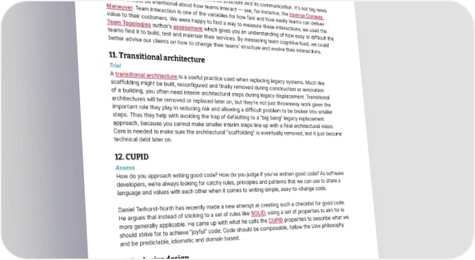 Techniques Thoughtworks Technology Radar very long time or be very challenging to achieve. With tactical forking a team can create a new fork of the codebase and use that to address and extract one particular concern or area while deleting the unnecessary code. Use of this technique would likely be just one part of a longer-term plan for the overall monolith. 10. Team cognitive load Trial A system’s architecture mimics an organizational structure and its communication. It’s not big news that we should be intentional about how teams interact — see, for instance, the Inverse Conway Maneuver. Team interaction is one of the variables for how fast and how easily teams can deliver value to their customers. We were happy to find a way to measure these interactions; we used the Team Topologies author’s assessment which gives you an understanding of how easy or difficult the teams find it to build, test and maintain their services. By measuring team cognitive load, we could better advise our clients on how to change their teams’ structure and evolve their interactions. 11. Transitional architecture Trial A transitional architecture is a useful practice used when replacing legacy systems. Much like scaffolding might be built, reconfigured and finally removed during construction or renovation of a building, you often need interim architectural steps during legacy displacement. Transitional architectures will be removed or replaced later on, but they’re not just throwaway work given the important role they play in reducing risk and allowing a difficult problem to be broken into smaller steps. Thus they help with avoiding the trap of defaulting to a “big bang” legacy replacement approach, because you cannot make smaller interim steps line up with a final architectural vision. Care is needed to make sure the architectural “scaffolding” is eventually removed, lest it just become technical debt later on. 12. CUPID Assess How do you approach writing good code? How do you judge if you’ve written good code? As software developers, we’re always looking for catchy rules, principles and patterns that we can use to share a language and values with each other when it comes to writing simple, easy-to-change code. Daniel Terhorst-North has recently made a new attempt at creating such a checklist for good code. He argues that instead of sticking to a set of rules like SOLID, using a set of properties to aim for is more generally applicable. He came up with what he calls the CUPID properties to describe what we should strive for to achieve “joyful” code: Code should be composable, follow the Unix philosophy and be predictable, idiomatic and domain based. 13. Inclusive design Assess We recommend organizations assess inclusive design as a way of making sure accessibility is treated as a first-class requirement. All too often requirements around accessibility and inclusivity are ignored until just before, if not just after, the release of software. The cheapest and simplest way to accommodate these requirements, while also providing early feedback to teams, is to incorporate © Thoughtworks, Inc. All Rights Reserved. 15