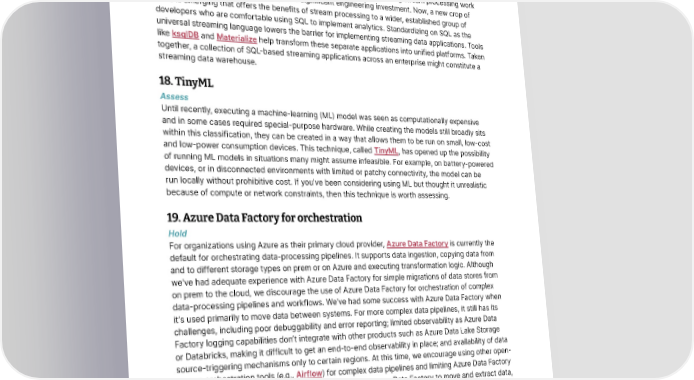 Techniques Thoughtworks Technology Radar 17. The streaming data warehouse Assess The need to respond quickly to customer insights has driven increasing adoption of event-driven architectures and stream processing. Frameworks such as Spark, Flink or Kafka Streams offer a paradigm where simple event consumers and producers can cooperate in complex networks to deliver real-time insights. But this programming style takes time and effort to master and when implemented as single-point applications, it lacks interoperability. Making stream processing work universally on a large scale can require a significant engineering investment. Now, a new crop of tools is emerging that offers the benefits of stream processing to a wider, established group of developers who are comfortable using SQL to implement analytics. Standardizing on SQL as the universal streaming language lowers the barrier for implementing streaming data applications. Tools like ksqlDB and Materialize help transform these separate applications into unified platforms. Taken together, a collection of SQL-based streaming applications across an enterprise might constitute a streaming data warehouse. 18. TinyML Assess Until recently, executing a machine-learning (ML) model was seen as computationally expensive and in some cases required special-purpose hardware. While creating the models still broadly sits within this classification, they can be created in a way that allows them to be run on small, low-cost and low-power consumption devices. This technique, called TinyML, has opened up the possibility of running ML models in situations many might assume infeasible. For example, on battery-powered devices, or in disconnected environments with limited or patchy connectivity, the model can be run locally without prohibitive cost. If you’ve been considering using ML but thought it unrealistic because of compute or network constraints, then this technique is worth assessing. 19. Azure Data Factory for orchestration Hold For organizations using Azure as their primary cloud provider, Azure Data Factory is currently the default for orchestrating data-processing pipelines. It supports data ingestion, copying data from and to different storage types on prem or on Azure and executing transformation logic. Although we’ve had adequate experience with Azure Data Factory for simple migrations of data stores from on prem to the cloud, we discourage the use of Azure Data Factory for orchestration of complex data-processing pipelines and workflows. We’ve had some success with Azure Data Factory when it’s used primarily to move data between systems. For more complex data pipelines, it still has its challenges, including poor debuggability and error reporting; limited observability as Azure Data Factory logging capabilities don’t integrate with other products such as Azure Data Lake Storage or Databricks, making it difficult to get an end-to-end observability in place; and availability of data source-triggering mechanisms only to certain regions. At this time, we encourage using other open- source orchestration tools (e.g., Airflow) for complex data pipelines and limiting Azure Data Factory for data copying or snapshotting. Our teams continue to use Data Factory to move and extract data, but for larger operations we recommend other, more well-rounded workflow tools. © Thoughtworks, Inc. All Rights Reserved. 17