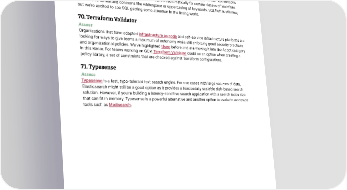 Tools Thoughtworks Technology Radar 69. SQLFluff Assess While linting is an ancient practice in the software world, it’s had slower adoption in the data world. SQLFluff is a cross-dialect SQL linter written in Python that ships with a simple command line interface (CLI), making it easy to incorporate into a CI/CD pipeline. If you’re comfortable with the default conventions, then SQLFluff works without any additional configuration after installing it and will enforce a strongly opinionated set of formatting standards; setting your own conventions involves adding a configuration dotfile. The CLI can automatically fix certain classes of violations that involve formatting concerns like whitespace or uppercasing of keywords. SQLFluff is still new, but we’re excited to see SQL getting some attention in the linting world. 70. Terraform Validator Assess Organizations that have adopted infrastructure as code and self-service infrastructure platforms are looking for ways to give teams a maximum of autonomy while still enforcing good security practices and organizational policies. We’ve highlighted tfsec before and are moving it into the Adopt category in this Radar. For teams working on GCP, Terraform Validator could be an option when creating a policy library, a set of constraints that are checked against Terraform configurations. 71. Typesense Assess Typesense is a fast, typo-tolerant text search engine. For use cases with large volumes of data, Elasticsearch might still be a good option as it provides a horizontally scalable disk-based search solution. However, if you’re building a latency-sensitive search application with a search index size that can fit in memory, Typesense is a powerful alternative and another option to evaluate alongside tools such as Meilisearch. © Thoughtworks, Inc. All Rights Reserved. 32