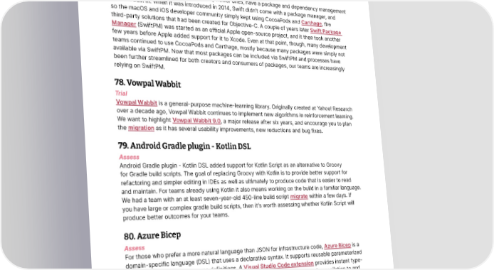 Languages and Frameworks Thoughtworks Technology Radar test suites and that it comes with a comprehensive set of matchers, which allow for expressive tests in an elegant internal DSL. In addition to its support for property-based testing — a technique we’ve highlighted previously in the Radar — our teams like the solid IntelliJ plugin and the growing community of support. 77. Swift Package Manager Trial Some programming languages, especially newer ones, have a package and dependency management solution built in. When it was introduced in 2014, Swift didn’t come with a package manager, and so the macOS and iOS developer community simply kept using CocoaPods and Carthage, the third-party solutions that had been created for Objective-C. A couple of years later Swift Package Manager (SwiftPM) was started as an official Apple open-source project, and it then took another few years before Apple added support for it to Xcode. Even at that point, though, many development teams continued to use CocoaPods and Carthage, mostly because many packages were simply not available via SwiftPM. Now that most packages can be included via SwiftPM and processes have been further streamlined for both creators and consumers of packages, our teams are increasingly relying on SwiftPM. 78. Vowpal Wabbit Trial Vowpal Wabbit is a general-purpose machine-learning library. Originally created at Yahoo! Research over a decade ago, Vowpal Wabbit continues to implement new algorithms in reinforcement learning. We want to highlight Vowpal Wabbit 9.0, a major release after six years, and encourage you to plan the migration as it has several usability improvements, new reductions and bug fixes. 79. Android Gradle plugin - Kotlin DSL Assess Android Gradle plugin - Kotlin DSL added support for Kotlin Script as an alternative to Groovy for Gradle build scripts. The goal of replacing Groovy with Kotlin is to provide better support for refactoring and simpler editing in IDEs as well as ultimately to produce code that is easier to read and maintain. For teams already using Kotlin it also means working on the build in a familiar language. We had a team with an at least seven-year-old 450-line build script migrate within a few days. If you have large or complex gradle build scripts, then it’s worth assessing whether Kotlin Script will produce better outcomes for your teams. 80. Azure Bicep Assess For those who prefer a more natural language than JSON for infrastructure code, Azure Bicep is a domain-specific language (DSL) that uses a declarative syntax. It supports reusable parameterized templates for modular resource definitions. A Visual Studio Code extension provides instant type- safety, intellisense and syntax checking, and the compiler allows bidirectional transpilation to and from ARM templates. Bicep’s resource-oriented DSL and native integration with the Azure ecosystem make it a compelling choice for Azure infrastructure development. 81. Capacitor Assess We’ve been debating the merits of cross-platform mobile development tools for nearly as long as we’ve been publishing the Technology Radar. We first noted a new generation of tools in 2011 when © Thoughtworks, Inc. All Rights Reserved. 35