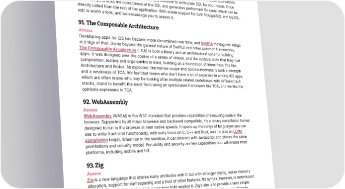 Languages and Frameworks Thoughtworks Technology Radar that the changes in your application’s primary data store are reflected in SpiceDB. Among other Zanzibar-inspired implementations, we find SpiceDB to be an interesting framework to assess for your authorization needs. 90. sqlc Assess sqlc is a compiler that generates type-safe idiomatic Go code from SQL. Unlike other approaches based on object-relational mapping (ORM), you continue to write plain SQL for your needs. Once invoked, sqlc checks the correctness of the SQL and generates performant Go code, which can be directly called from the rest of the application. With stable support for both PostgreSQL and MySQL, sqlc is worth a look, and we encourage you to assess it. 91. The Composable Architecture Assess Developing apps for iOS has become more streamlined over time, and SwiftUI moving into Adopt is a sign of that. Going beyond the general nature of SwiftUI and other common frameworks, The Composable Architecture (TCA) is both a library and an architectural style for building apps. It was designed over the course of a series of videos, and the authors state that they had composition, testing and ergonomics in mind, building on a foundation of ideas from The Elm Architecture and Redux. As expected, the narrow scope and opinionatedness is both a strength and a weakness of TCA. We feel that teams who don’t have a lot of expertise in writing iOS apps, which are often teams who may be looking after multiple related codebases with different tech stacks, stand to benefit the most from using an opinionated framework like TCA, and we like the opinions expressed in TCA. 92. WebAssembly Assess WebAssembly (WASM) is the W3C standard that provides capabilities of executing code in the browser. Supported by all major browsers and backward compatible, it’s a binary compilation format designed to run in the browser at near native speeds. It opens up the range of languages you can use to write front-end functionality, with early focus on C, C++ and Rust, and it’s also an LLVM compilation target. When run in the sandbox, it can interact with JavaScript and shares the same permissions and security model. Portability and security are key capabilities that will enable most platforms, including mobile and IoT. 93. Zig Assess Zig is a new language that shares many attributes with C but with stronger typing, easier memory allocation, support for namespacing and a host of other features. Its syntax, however, is reminiscent of JavaScript rather than C, which some may hold against it. Zig’s aim is to provide a very simple language with straightforward compilation that minimizes side-effects and delivers predictable, easy-to-trace execution. Zig also provides simplified access to LLVM’s cross-compilation capability. Some of our developers have found this feature so viable, they’re using Zig as a cross-compiler even though they aren’t writing Zig code. Zig is a novel language and worth looking into for applications where C is being considered or already in use as well as for low-level systems applications that require explicit memory manipulation. © Thoughtworks, Inc. All Rights Reserved. 38