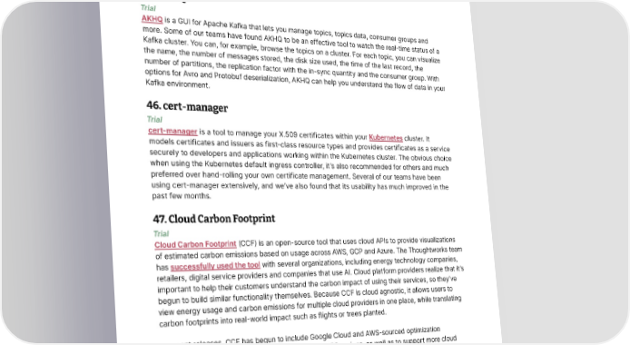 Tools Thoughtworks Technology Radar 44. tfsec Adopt For our projects using Terraform, tfsec has quickly become a default static analysis tool to detect potential security risks. It’s easy to integrate into a CI pipeline and has a growing library of checks against all of the major cloud providers and platforms like Kubernetes. Given its ease of use, we believe tfsec could be a good addition to any Terraform project. 45. AKHQ Trial AKHQ is a GUI for Apache Kafka that lets you manage topics, topics data, consumer groups and more. Some of our teams have found AKHQ to be an effective tool to watch the real-time status of a Kafka cluster. You can, for example, browse the topics on a cluster. For each topic, you can visualize the name, the number of messages stored, the disk size used, the time of the last record, the number of partitions, the replication factor with the in-sync quantity and the consumer group. With options for Avro and Protobuf deserialization, AKHQ can help you understand the flow of data in your Kafka environment. 46. cert-manager Trial cert-manager is a tool to manage your X.509 certificates within your Kubernetes cluster. It models certificates and issuers as first-class resource types and provides certificates as a service securely to developers and applications working within the Kubernetes cluster. The obvious choice when using the Kubernetes default ingress controller, it’s also recommended for others and much preferred over hand-rolling your own certificate management. Several of our teams have been using cert-manager extensively, and we’ve also found that its usability has much improved in the past few months. 47. Cloud Carbon Footprint Trial Cloud Carbon Footprint (CCF) is an open-source tool that uses cloud APIs to provide visualizations of estimated carbon emissions based on usage across AWS, GCP and Azure. The Thoughtworks team has successfully used the tool with several organizations, including energy technology companies, retailers, digital service providers and companies that use AI. Cloud platform providers realize that it’s important to help their customers understand the carbon impact of using their services, so they’ve begun to build similar functionality themselves. Because CCF is cloud agnostic, it allows users to view energy usage and carbon emissions for multiple cloud providers in one place, while translating carbon footprints into real-world impact such as flights or trees planted. In recent releases, CCF has begun to include Google Cloud and AWS-sourced optimization recommendations alongside potential energy and CO2 savings, as well as to support more cloud instance types such as GPU instances. Given the traction the tool has received and the continued addition of new features, we feel confident moving it to Trial. © Thoughtworks, Inc. All Rights Reserved. 26