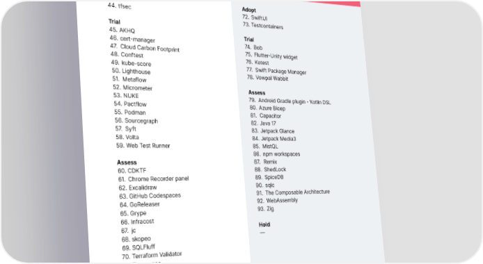 Thoughtworks Technology Radar The Radar Tools Languages and Frameworks Adopt Adopt 44. tfsec 72. SwiftUI 73. Testcontainers Trial 45. AKHQ Trial 46. cert-manager 74. Bob 47. Cloud Carbon Footprint 75. Flutter-Unity widget 48. Conftest 76. Kotest 49. kube-score 77. Swift Package Manager 50. Lighthouse 78. Vowpal Wabbit 51. Metaflow 52. Micrometer Assess 53. NUKE 79. Android Gradle plugin - Kotlin DSL 54. Pactflow 80. Azure Bicep 55. Podman 81. Capacitor 56. Sourcegraph 82. Java 17 57. Syft 83. Jetpack Glance 58. Volta 84. Jetpack Media3 59. Web Test Runner 85. MistQL 86. npm workspaces Assess 87. Remix 60. CDKTF 88. ShedLock 61. Chrome Recorder panel 89. SpiceDB 62. Excalidraw 90. sqlc 63. GitHub Codespaces 91. The Composable Architecture 64. GoReleaser 92. WebAssembly 65. Grype 93. Zig 66. Infracost 67. jc Hold 68. skopeo — 69. SQLFluff 70. Terraform Validator 71. Typesense Hold — © Thoughtworks, Inc. All Rights Reserved.