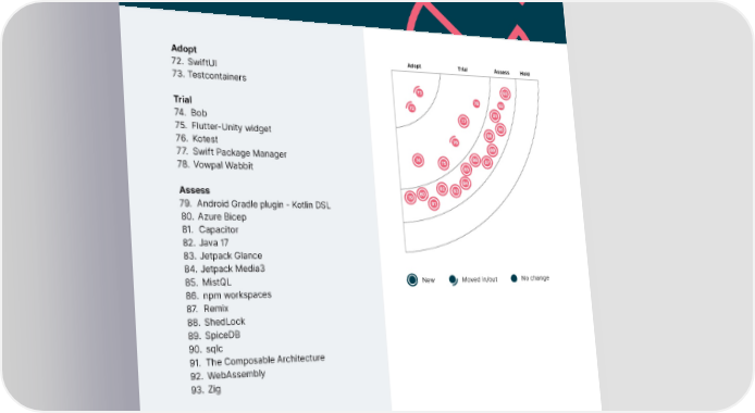 Thoughtworks Technology Radar 22 Languages and 60 21 17 18 61 62 63 16 64 65 Frameworks 47 20 15 9 11 46 50 66 48 67 14 7 8 10 45 49 51 53 68 6 52 19 13 55 69 5 2 54 56 57 70 12 4 44 58 3 1 59 71 Adopt Hold Assess Trial Adopt Adopt Trial Assess Hold 72. SwiftUI 73. Testcontainers 23 93 35 73 24 25 78 92 Trial 26 72 91 36 77 74. Bob 28 90 37 27 89 75. Flutter-Unity widget 29 30 76 76. Kotest 38 32 88 31 33 86 77. Swift Package Manager 39 74 75 87 78. Vowpal Wabbit 85 40 34 41 84 42 82 83 Assess 79 80 79. Android Gradle plugin - Kotlin DSL 81 43 80. Azure Bicep 81. Capacitor 82. Java 17 83. Jetpack Glance 84. Jetpack Media3 85. MistQL New Moved in/out No change 86. npm workspaces 87. Remix 88. ShedLock 89. SpiceDB 90. sqlc 91. The Composable Architecture 92. WebAssembly 93. Zig Hold — © Thoughtworks, Inc. All Rights Reserved.