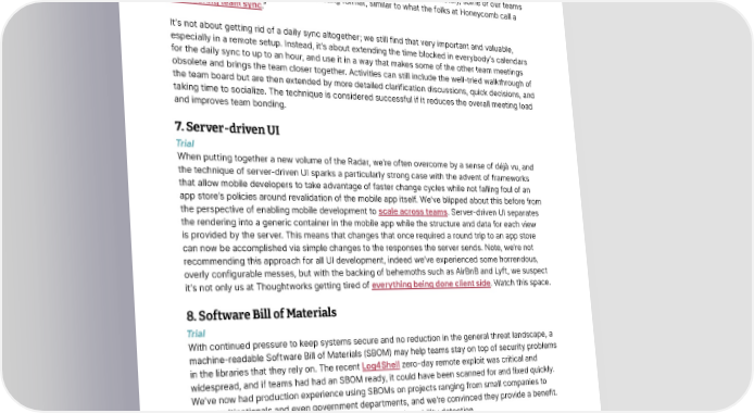Techniques Thoughtworks Technology Radar 6. Rethinking remote standups Trial The term standup originated from the idea of standing up during this daily sync meeting, with the goal of making it short. It’s a common principle many teams try to abide by in their standups: keep it crisp and to the point. But we’re now seeing teams challenge that principle and rethinking remote standups. When co-located, there are lots of opportunities during the rest of the day to sync up with each other spontaneously, as a complement to the short standup. Remotely, some of our teams are now experimenting with a longer meeting format, similar to what the folks at Honeycomb call a “meandering team sync.” It’s not about getting rid of a daily sync altogether; we still find that very important and valuable, especially in a remote setup. Instead, it’s about extending the time blocked in everybody’s calendars for the daily sync to up to an hour, and use it in a way that makes some of the other team meetings obsolete and brings the team closer together. Activities can still include the well-tried walkthrough of the team board but are then extended by more detailed clarification discussions, quick decisions, and taking time to socialize. The technique is considered successful if it reduces the overall meeting load and improves team bonding. 7. Server-driven UI Trial When putting together a new volume of the Radar, we’re often overcome by a sense of déjà vu, and the technique of server-driven UI sparks a particularly strong case with the advent of frameworks that allow mobile developers to take advantage of faster change cycles while not falling foul of an app store’s policies around revalidation of the mobile app itself. We’ve blipped about this before from the perspective of enabling mobile development to scale across teams. Server-driven UI separates the rendering into a generic container in the mobile app while the structure and data for each view is provided by the server. This means that changes that once required a round trip to an app store can now be accomplished via simple changes to the responses the server sends. Note, we’re not recommending this approach for all UI development, indeed we’ve experienced some horrendous, overly configurable messes, but with the backing of behemoths such as AirBnB and Lyft, we suspect it’s not only us at Thoughtworks getting tired of everything being done client side. Watch this space. 8. Software Bill of Materials Trial With continued pressure to keep systems secure and no reduction in the general threat landscape, a machine-readable Software Bill of Materials (SBOM) may help teams stay on top of security problems in the libraries that they rely on. The recent Log4Shell zero-day remote exploit was critical and widespread, and if teams had had an SBOM ready, it could have been scanned for and fixed quickly. We’ve now had production experience using SBOMs on projects ranging from small companies to large multinationals and even government departments, and we’re convinced they provide a benefit. Tools such as Syft make it easy to use an SBOM for vulnerability detection. 9. Tactical forking Trial Tactical forking is a technique that can assist with restructuring or migrating from monolithic codebases to microservices. Specifically, this technique offers one possible alternative to the more common approach of fully modularizing the codebase first, which in many circumstances can take a © Thoughtworks, Inc. All Rights Reserved. 14