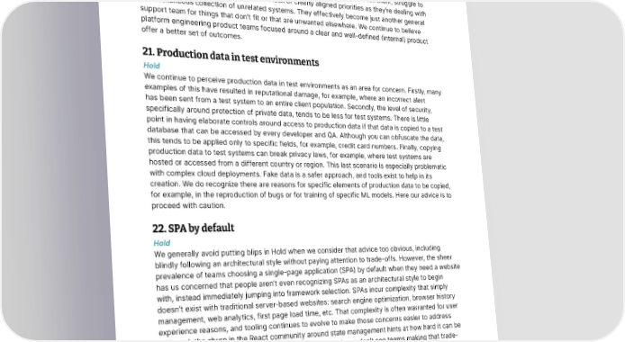 Techniques Thoughtworks Technology Radar 20. Miscellaneous platform teams Hold We previously featured platform engineering product teams in Adopt as a good way for internal platform teams to operate, thus enabling delivery teams to self-service deploy and operate systems with reduced lead time and stack complexity. Unfortunately we’re seeing the “platform team” label applied to teams dedicated to projects that don’t have clear outcomes or a well-defined set of customers. As a result, these miscellaneous platform teams, as we call them, struggle to deliver due to high cognitive loads and a lack of clearly aligned priorities as they’re dealing with a miscellaneous collection of unrelated systems. They effectively become just another general support team for things that don’t fit or that are unwanted elsewhere. We continue to believe platform engineering product teams focused around a clear and well-defined (internal) product offer a better set of outcomes. 21. Production data in test environments Hold We continue to perceive production data in test environments as an area for concern. Firstly, many examples of this have resulted in reputational damage, for example, where an incorrect alert has been sent from a test system to an entire client population. Secondly, the level of security, specifically around protection of private data, tends to be less for test systems. There is little point in having elaborate controls around access to production data if that data is copied to a test database that can be accessed by every developer and QA. Although you can obfuscate the data, this tends to be applied only to specific fields, for example, credit card numbers. Finally, copying production data to test systems can break privacy laws, for example, where test systems are hosted or accessed from a different country or region. This last scenario is especially problematic with complex cloud deployments. Fake data is a safer approach, and tools exist to help in its creation. We do recognize there are reasons for specific elements of production data to be copied, for example, in the reproduction of bugs or for training of specific ML models. Here our advice is to proceed with caution. 22. SPA by default Hold We generally avoid putting blips in Hold when we consider that advice too obvious, including blindly following an architectural style without paying attention to trade-offs. However, the sheer prevalence of teams choosing a single-page application (SPA) by default when they need a website has us concerned that people aren’t even recognizing SPAs as an architectural style to begin with, instead immediately jumping into framework selection. SPAs incur complexity that simply doesn’t exist with traditional server-based websites: search engine optimization, browser history management, web analytics, first page load time, etc. That complexity is often warranted for user experience reasons, and tooling continues to evolve to make those concerns easier to address (although the churn in the React community around state management hints at how hard it can be to get a generally applicable solution). Too often, though, we don’t see teams making that trade- off analysis, blindly accepting the complexity of SPAs by default even when the business needs don’t justify it. Indeed, we’ve started to notice that many newer developers aren’t even aware of an alternative approach, as they’ve spent their entire career in a framework like React. We believe that many websites will benefit from the simplicity of server-side logic, and we’re encouraged by techniques like Hotwire that help close the gap on user experience. © Thoughtworks, Inc. All Rights Reserved. 18