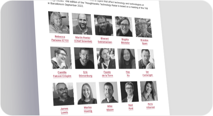 Thoughtworks Technology Radar Contributors The Technology Advisory Board (TAB) is a group of 17 senior technologists at Thoughtworks. The TAB meets twice a year face-to-face and biweekly virtually. Its primary role is to be an advisory group for Thoughtworks CTO, Rebecca Parsons. The TAB acts as a broad body that can look at topics that affect technology and technologists at Thoughtworks. This edition of the Thoughtworks Technology Radar is based on a meeting of the TAB in Barcelona in September 2022. Rebecca Martin Fowler Bharani Birgitta Brandon Parsons (CTO) (Chief Scientist) Subramaniam Böckeler Byars Camilla Erik Fausto Hao Ian Falconi Crispim Dörnenburg de la Torre Xu Cartwright James Marisa Mike Neal Perla Lewis Hoenig Mason Ford Villarreal Scott Shangqi Shaw Liu © Thoughtworks, Inc. All Rights Reserved. 5