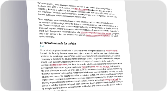Techniques Thoughtworks Technology Radar contains sensitive or personally identifiable information; users might be reluctant to share data or local data protection legislation may prevent us from moving data to a central location. Federated ML is a decentralized technique for training on a large and diverse set of data that allows the data to remain remote — for example, on a user’s device. Network bandwidth and the computational limitations of devices still present significant technical challenges, but we like the way federated ML leaves users in control of their own personal information. 9. Incremental developer platform Trial We’ve been writing about developer platforms and how to build them in almost every edition of the Radar since 2017. In the meantime, the Team Topologies book has also done a great job of describing the ideal of a platform that supports developers with “self-service APIs, tools, services and knowledge.” However, we often see teams shooting for too much of that platform vision too fast. Instead, building an incremental developer platform is key. Team Topologies recommends to always strive for what they call the “Thinnest Viable Platform” necessary at any given stage, where the first version could even be just a set of documentation on a wiki. The next increment could increase the service level by providing templates or allowing teams to create pull requests. Further increments could then introduce self-service APIs, but only if valuable. In short, even though we’ve cautioned against fully ticket-driven platform operating models, going from zero to self-service is the other extreme. Pace yourself, treat your platform as a product and build it up incrementally. 10. Micro frontends for mobile Trial Since introducing them in the Radar in 2016, we’ve seen widespread adoption of micro frontends for web UIs. Recently, however, we’ve seen projects extend this architectural style to include micro frontends for mobile apps as well. When an app becomes sufficiently large and complex, it becomes necessary to distribute the development over multiple teams. This presents a number of challenges around team autonomy, repository structures and integration frameworks. In the past we’ve mentioned Atlas and BeeHive, but these frameworks failed to gain traction and are no longer in active development. More recent approaches include Tuist or the Swift Package Manager for integrating the work of multiple teams into a single app. But in our experience, teams often end up implementing their own framework for integration. While we definitely see a need for modularity in scaling up mobile development teams, the case for micro frontends is less certain. This is because while micro frontends imply a direct correspondence between teams and pages or components, this structure could end up blurring responsibilities for business domain contexts, thereby increasing team cognitive load. Our advice is to follow the basics of good, clean application design, embrace modularity when scaling up to multiple teams and adopt a micro frontend architecture only when the modules and the business domain are strongly aligned. 11. Observability for CI/CD pipelines Trial Observability practices have shifted the conversation from monitoring for well-understood problems to helping troubleshoot unknown problems in distributed systems. We’ve seen success taking that perspective outside of the traditional production environment by applying observability for CI/CD © Thoughtworks, Inc. All Rights Reserved. 14