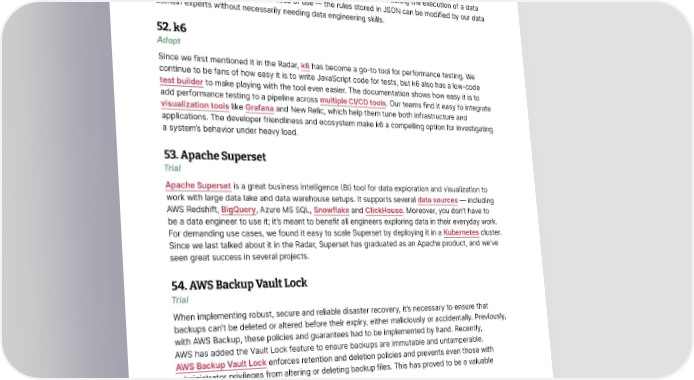 Tools Thoughtworks Technology Radar 51. Great Expectations Adopt Great Expectations has become a sensible default for our teams in the data quality space, which is why we recommend adopting it — not only for the lack of better alternatives but also because our teams have reported great results in several client projects. Great Expectations is a framework that allows you to craft built-in controls that flag anomalies or quality issues in data pipelines. Just as unit tests run in a build pipeline, Great Expectations makes assertions during the execution of a data pipeline. We like its simplicity and ease of use — the rules stored in JSON can be modified by our data domain experts without necessarily needing data engineering skills. 52. k6 Adopt Since we first mentioned it in the Radar, k6 has become a go-to tool for performance testing. We continue to be fans of how easy it is to write JavaScript code for tests, but k6 also has a low-code test builder to make playing with the tool even easier. The documentation shows how easy it is to add performance testing to a pipeline across multiple CI/CD tools. Our teams find it easy to integrate visualization tools like Grafana and New Relic, which help them tune both infrastructure and applications. The developer friendliness and ecosystem make k6 a compelling option for investigating a system’s behavior under heavy load. 53. Apache Superset Trial Apache Superset is a great business intelligence (BI) tool for data exploration and visualization to work with large data lake and data warehouse setups. It supports several data sources — including AWS Redshift, BigQuery, Azure MS SQL, Snowflake and ClickHouse. Moreover, you don’t have to be a data engineer to use it; it’s meant to benefit all engineers exploring data in their everyday work. For demanding use cases, we found it easy to scale Superset by deploying it in a Kubernetes cluster. Since we last talked about it in the Radar, Superset has graduated as an Apache product, and we’ve seen great success in several projects. 54. AWS Backup Vault Lock Trial When implementing robust, secure and reliable disaster recovery, it’s necessary to ensure that backups can’t be deleted or altered before their expiry, either maliciously or accidentally. Previously, with AWS Backup, these policies and guarantees had to be implemented by hand. Recently, AWS has added the Vault Lock feature to ensure backups are immutable and untamperable. AWS Backup Vault Lock enforces retention and deletion policies and prevents even those with administrator privileges from altering or deleting backup files. This has proved to be a valuable addition and fills a previously empty space. 55. AWS Control Tower Trial Multi-team account management is a challenge in AWS, especially in setup and governance; AWS Control Tower is an attempt to address this challenge. Our team has reported good results using it to manage accounts and access control for multiple teams in the organization through a single, centralized place. © Thoughtworks, Inc. All Rights Reserved. 28