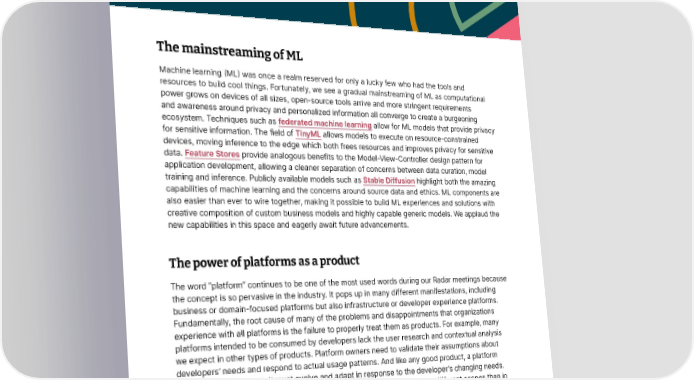 Thoughtworks Technology Radar Themes The mainstreaming of ML Machine learning (ML) was once a realm reserved for only a lucky few who had the tools and resources to build cool things. Fortunately, we see a gradual mainstreaming of ML as computational power grows on devices of all sizes, open-source tools arrive and more stringent requirements and awareness around privacy and personalized information all converge to create a burgeoning ecosystem. Techniques such as federated machine learning allow for ML models that provide privacy for sensitive information. The field of TinyML allows models to execute on resource-constrained devices, moving inference to the edge which both frees resources and improves privacy for sensitive data. Feature Stores provide analogous benefits to the Model-View-Controller design pattern for application development, allowing a cleaner separation of concerns between data curation, model training and inference. Publicly available models such as Stable Diffusion highlight both the amazing capabilities of machine learning and the concerns around source data and ethics. ML components are also easier than ever to wire together, making it possible to build ML experiences and solutions with creative composition of custom business models and highly capable generic models. We applaud the new capabilities in this space and eagerly await future advancements. The power of platforms as a product The word “platform” continues to be one of the most used words during our Radar meetings because the concept is so pervasive in the industry. It pops up in many different manifestations, including business or domain-focused platforms but also infrastructure or developer experience platforms. Fundamentally, the root cause of many of the problems and disappointments that organizations experience with all platforms is the failure to properly treat them as products. For example, many platforms intended to be consumed by developers lack the user research and contextual analysis we expect in other types of products. Platform owners need to validate their assumptions about developers’ needs and respond to actual usage patterns. And like any good product, a platform needs ongoing support. It must evolve and adapt in response to the developer’s changing needs. Additionally, roles like project managers and business analysts often have different scopes than in traditional applications. The “platform as a product” metaphor only works when fully embraced as a practice rather than a trendy phrase. © Thoughtworks, Inc. All Rights Reserved. 6