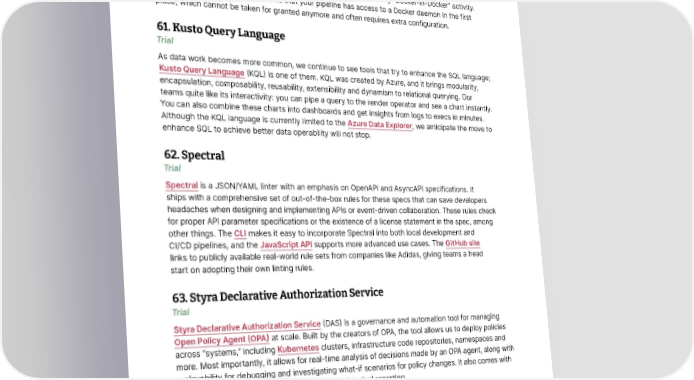 Tools Thoughtworks Technology Radar 60. Kaniko Trial Most of today’s CI/CD pipeline tools and platforms are built on containers as runtimes. Many of our teams are using Kaniko to build container images from within those container-based pipelines. This comes as part of a trend away from Docker as the de facto standard for container runtimes. With Kaniko, you can build your images without using a Docker daemon. This helps avoid the security issue of Docker’s “privileged” mode, which would be necessary for any “Docker-in-Docker” activity. Moreover, you don’t have to assume that your pipeline has access to a Docker daemon in the first place, which cannot be taken for granted anymore and often requires extra configuration. 61. Kusto Query Language Trial As data work becomes more common, we continue to see tools that try to enhance the SQL language; Kusto Query Language (KQL) is one of them. KQL was created by Azure, and it brings modularity, encapsulation, composability, reusability, extensibility and dynamism to relational querying. Our teams quite like its interactivity: you can pipe a query to the render operator and see a chart instantly. You can also combine these charts into dashboards and get insights from logs to execs in minutes. Although the KQL language is currently limited to the Azure Data Explorer, we anticipate the move to enhance SQL to achieve better data operability will not stop. 62. Spectral Trial Spectral is a JSON/YAML linter with an emphasis on OpenAPI and AsyncAPI specifications. It ships with a comprehensive set of out-of-the-box rules for these specs that can save developers headaches when designing and implementing APIs or event-driven collaboration. These rules check for proper API parameter specifications or the existence of a license statement in the spec, among other things. The CLI makes it easy to incorporate Spectral into both local development and CI/CD pipelines, and the JavaScript API supports more advanced use cases. The GitHub site links to publicly available real-world rule sets from companies like Adidas, giving teams a head start on adopting their own linting rules. 63. Styra Declarative Authorization Service Trial Styra Declarative Authorization Service (DAS) is a governance and automation tool for managing Open Policy Agent (OPA) at scale. Built by the creators of OPA, the tool allows us to deploy policies across “systems,” including Kubernetes clusters, infrastructure code repositories, namespaces and more. Most importantly, it allows for real-time analysis of decisions made by an OPA agent, along with replayability for debugging and investigating what-if scenarios for policy changes. It also comes with an audit log that can help security teams with historical reporting. © Thoughtworks, Inc. All Rights Reserved. 30