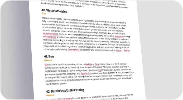 Platforms Thoughtworks Technology Radar 39. Teleport Trial Teleport is a tool for zero trust network access to infrastructure. Traditional setups require complex policies or jump servers to restrict access to critical resources. Teleport, however, simplifies this with a unified access plane and with fine-grained authorization controls that replace jump servers, VPNs or shared credentials. Implemented as a single binary with out-of-the-box support for several protocols (including SSH, RDP, Kubernetes API, MySQL, MongoDB and PostgreSQL wire protocols), Teleport makes it easy to set up and manage secured access across Linux, Windows or Kubernetes environments. Since we first mentioned it in the Radar, a few teams have used Teleport and our overall positive experience prompted us to highlight it. 40. VictoriaMetrics Trial Modern observability relies on collecting and aggregating an exhaustive set of granular metrics to fully understand, predict and analyze system behavior. But when applied to a cloud native system composed of many redundant and cooperating processes and hosts, the cardinality (or number of unique time series) becomes unwieldy because it grows exponentially with each additional service, container, node, cluster, etc. When dealing with high-cardinality data, we’ve found that VictoriaMetrics performs well. VictoriaMetrics is particularly useful for operating Kubernetes-hosted microservice architectures, and the VictoriaMetrics operator makes it easy for teams to implement their own monitoring in a self-service way. We also like its componentized architecture and ability to continue collecting metrics even when the central server is unavailable. Although our team has been happy with VictoriaMetrics, this is a rapidly evolving area, and we’d recommend keeping an eye on other high-performance, Prometheus-compatible time series databases such as Cortex or Thanos. 41. Bun Assess Bun is a new JavaScript runtime, similar to Node.js or Deno. Unlike Node.js or Deno, however, Bun is built using WebKit’s JavaScriptCore instead of Chrome’s V8 engine. Designed as a drop-in replacement for Node.js, Bun is a single binary (written in Zig) that acts as a bundler, transpiler and package manager for JavaScript and TypeScript applications. Bun is currently in beta, so expect bugs or compatibility issues with a few Node.js libraries. However, it’s been built from the ground up with several optimizations, including fast startup and improved server-side rendering, and we believe it’s worthwhile to assess. 42. Databricks Unity Catalog Assess Databricks Unity Catalog is a data governance solution for assets such as files, tables or machine learning models in a lakehouse. Although you’ll find several platforms in the enterprise data governance space, if you’re already using other Databricks solutions, you should certainly assess Unity Catalog. We want to highlight that while these governance platforms usually implement a centralized solution for better consistency across workspaces and workloads, the responsibility to govern should be federated by enabling individual teams to govern their own assets. © Thoughtworks, Inc. All Rights Reserved. 24