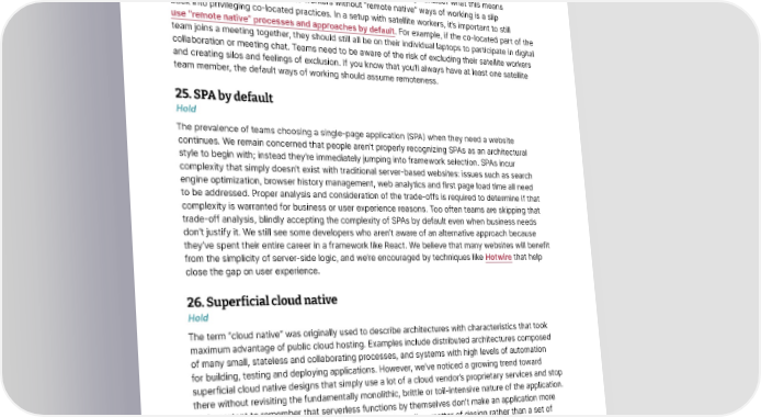 Techniques Thoughtworks Technology Radar 24. Satellite workers without “remote native” Hold The term “remote team setup” does not just describe one setup; it encompasses multiple patterns and flavors. And many teams have been changing patterns recently. They’re coming out of the “everybody always remote” mode that was forced on them by a pandemic and moving into a pattern of (often rotating) satellite workers, where part of the team is co-located and part of the team is remote. We see many of them failing to properly consider what this means for their ways of working. Satellite workers without “remote native” ways of working is a slip back into privileging co-located practices. In a setup with satellite workers, it’s important to still use “remote native” processes and approaches by default. For example, if the co-located part of the team joins a meeting together, they should still all be on their individual laptops to participate in digital collaboration or meeting chat. Teams need to be aware of the risk of excluding their satellite workers and creating silos and feelings of exclusion. If you know that you’ll always have at least one satellite team member, the default ways of working should assume remoteness. 25. SPA by default Hold The prevalence of teams choosing a single-page application (SPA) when they need a website continues. We remain concerned that people aren’t properly recognizing SPAs as an architectural style to begin with; instead they’re immediately jumping into framework selection. SPAs incur complexity that simply doesn’t exist with traditional server-based websites: issues such as search engine optimization, browser history management, web analytics and first page load time all need to be addressed. Proper analysis and consideration of the trade-offs is required to determine if that complexity is warranted for business or user experience reasons. Too often teams are skipping that trade-off analysis, blindly accepting the complexity of SPAs by default even when business needs don’t justify it. We still see some developers who aren’t aware of an alternative approach because they’ve spent their entire career in a framework like React. We believe that many websites will benefit from the simplicity of server-side logic, and we’re encouraged by techniques like Hotwire that help close the gap on user experience. 26. Superficial cloud native Hold The term “cloud native” was originally used to describe architectures with characteristics that took maximum advantage of public cloud hosting. Examples include distributed architectures composed of many small, stateless and collaborating processes, and systems with high levels of automation for building, testing and deploying applications. However, we’ve noticed a growing trend toward superficial cloud native designs that simply use a lot of a cloud vendor’s proprietary services and stop there without revisiting the fundamentally monolithic, brittle or toil-intensive nature of the application. It’s important to remember that serverless functions by themselves don’t make an application more resilient or easier to maintain and that cloud native is really a matter of design rather than a set of implementation choices. © Thoughtworks, Inc. All Rights Reserved. 19