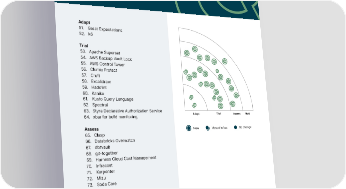 Thoughtworks Technology Radar Tools Adopt 51. Great Expectations 52. k6 26 Trial 66 53. Apache Superset 22 23 65 25 21 67 68 54. AWS Backup Vault Lock 20 69 76 55. AWS Control Tower 19 11 56 70 56. Clumio Protect 18 53 57 10 12 55 71 57. Cruft 17 13 54 8 72 58. Excalidraw 24 58 59 60 59. Hadolint 16 7 9 73 61 60. Kaniko 15 6 74 3 51 62 63 2 61. Kusto Query Language 5 62. Spectral 14 4 52 64 75 1 63. Styra Declarative Authorization Service Hold Assess Trial Adopt Adopt Trial Assess Hold 64. xbar for build monitoring 29 80 82 27 79 81 102 Assess 41 30 New 89 No change Moved in/out 65. Clasp 31 28 101 42 32 78 87 88 100 66. Databricks Overwatch 77 67. dbtvault 43 33 85 99 68. git-together 44 34 35 86 98 84 45 69. Harness Cloud Cost Management 36 38 97 70. Infracost 37 40 96 39 83 71. Karpenter 46 47 94 95 72. Mizu 103 48 92 93 73. Soda Core 49 50 90 91 74. Teller 75. Xcode Cloud Hold 76. Online services for formatting or parsing code © Thoughtworks, Inc. All Rights Reserved.